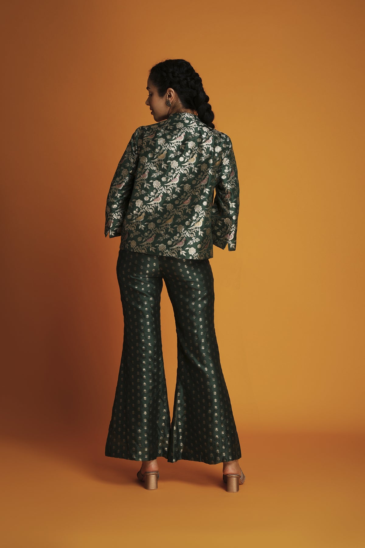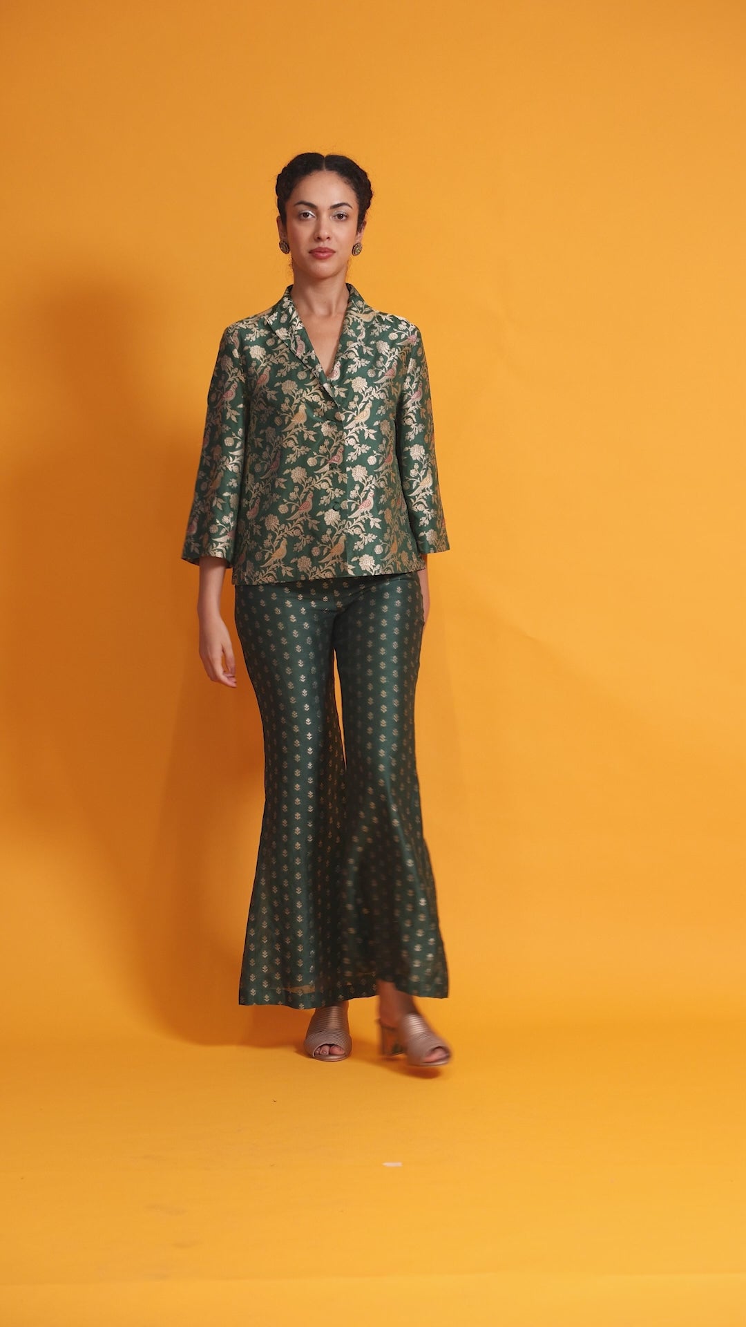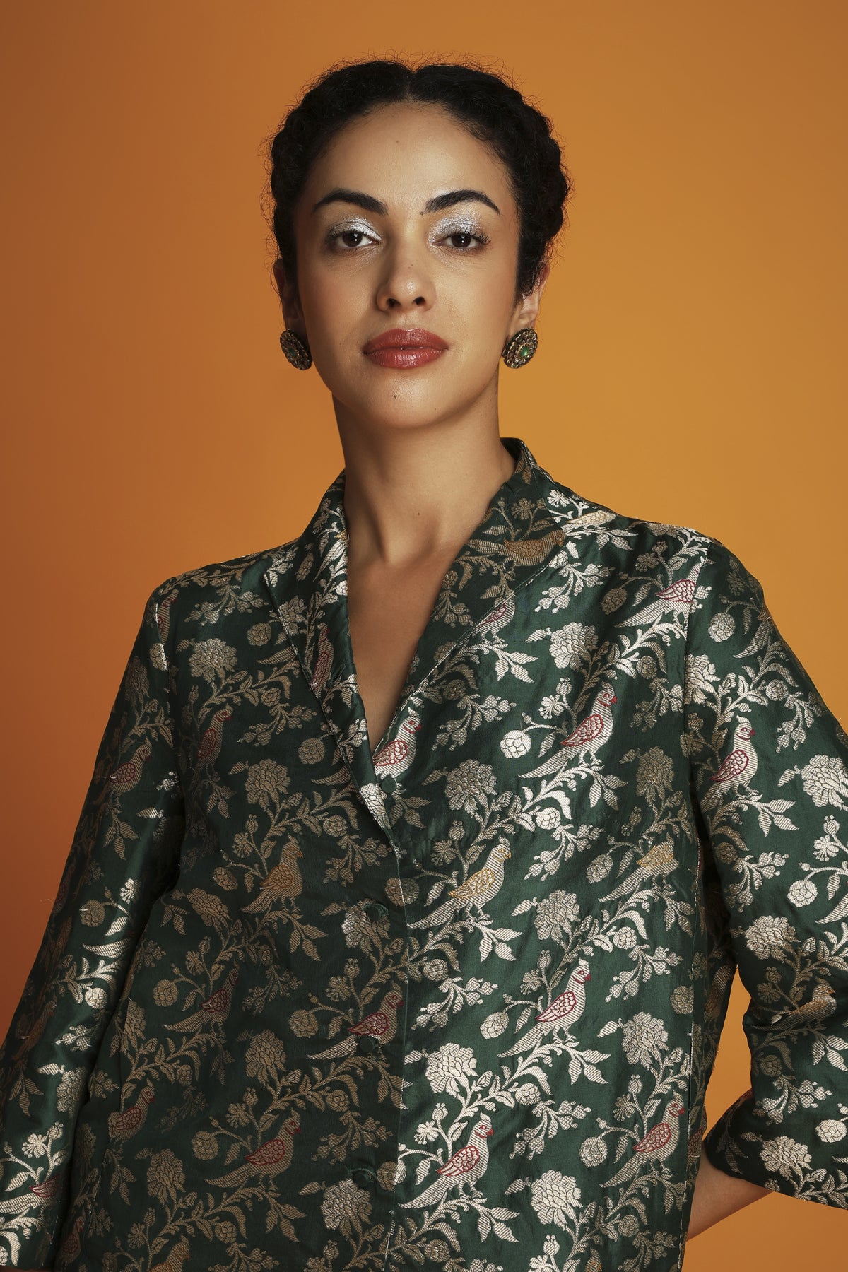 An emerald handwoven silk brocade swing jacket with a jaal design is a modern and chic choice that combines traditional craftsmanship with contemporary style, making it an elegant addition to your wardrobe.
