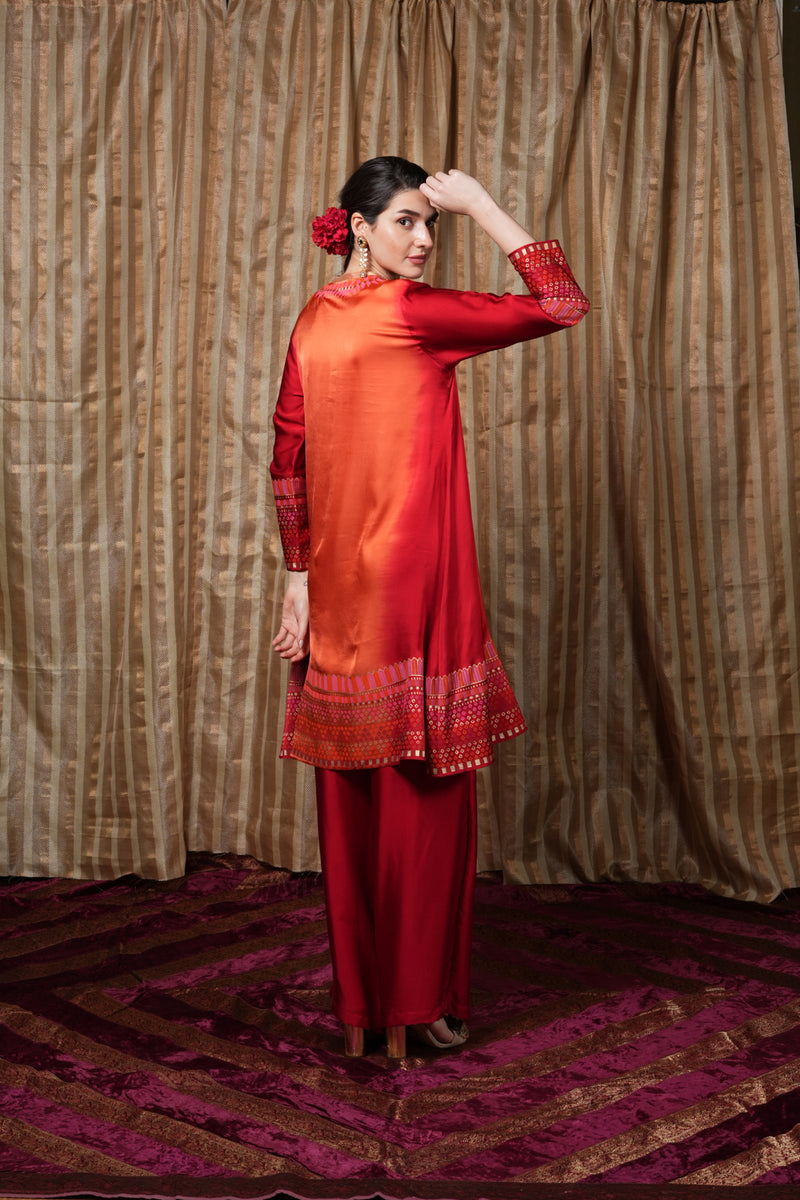 Red Tussar Block Printed & Marodi Hand Embroidered Kurta Set
