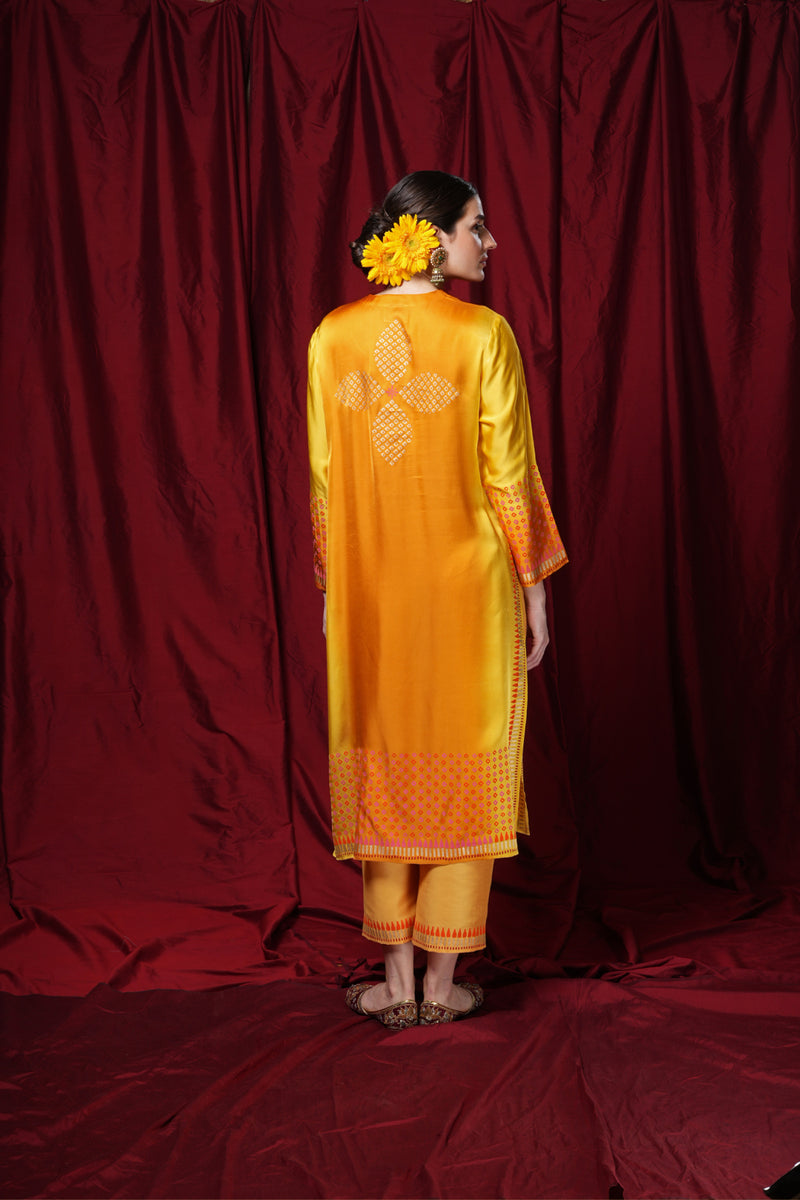Ivory & Marigold Yellow Pure Silk Floral Printed One-Shoulder Shirt Tunic Set