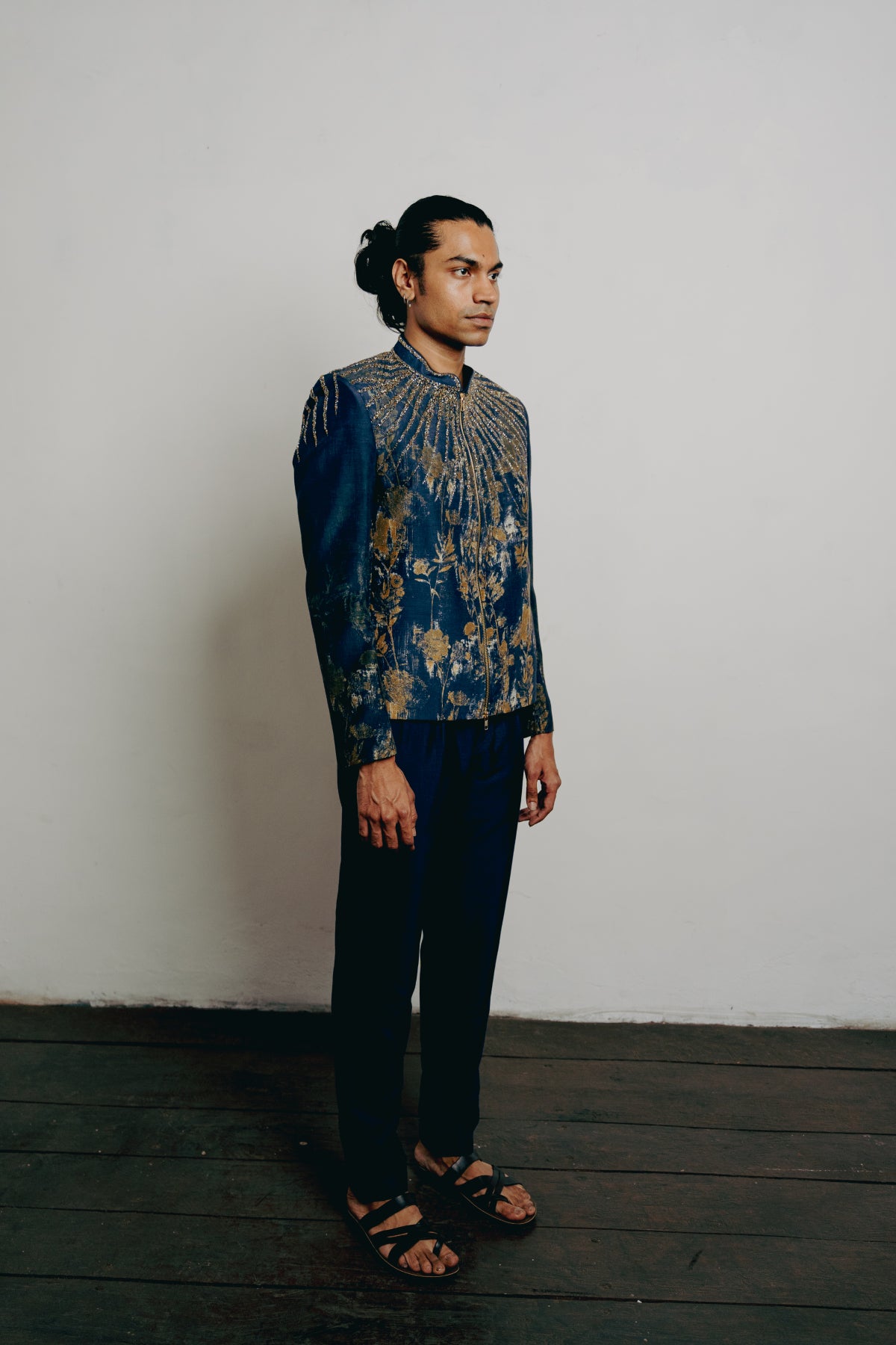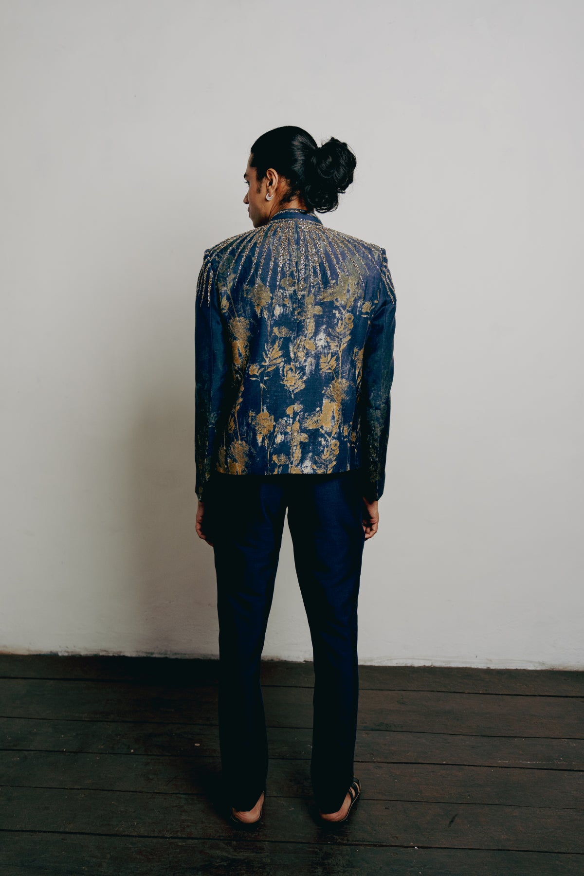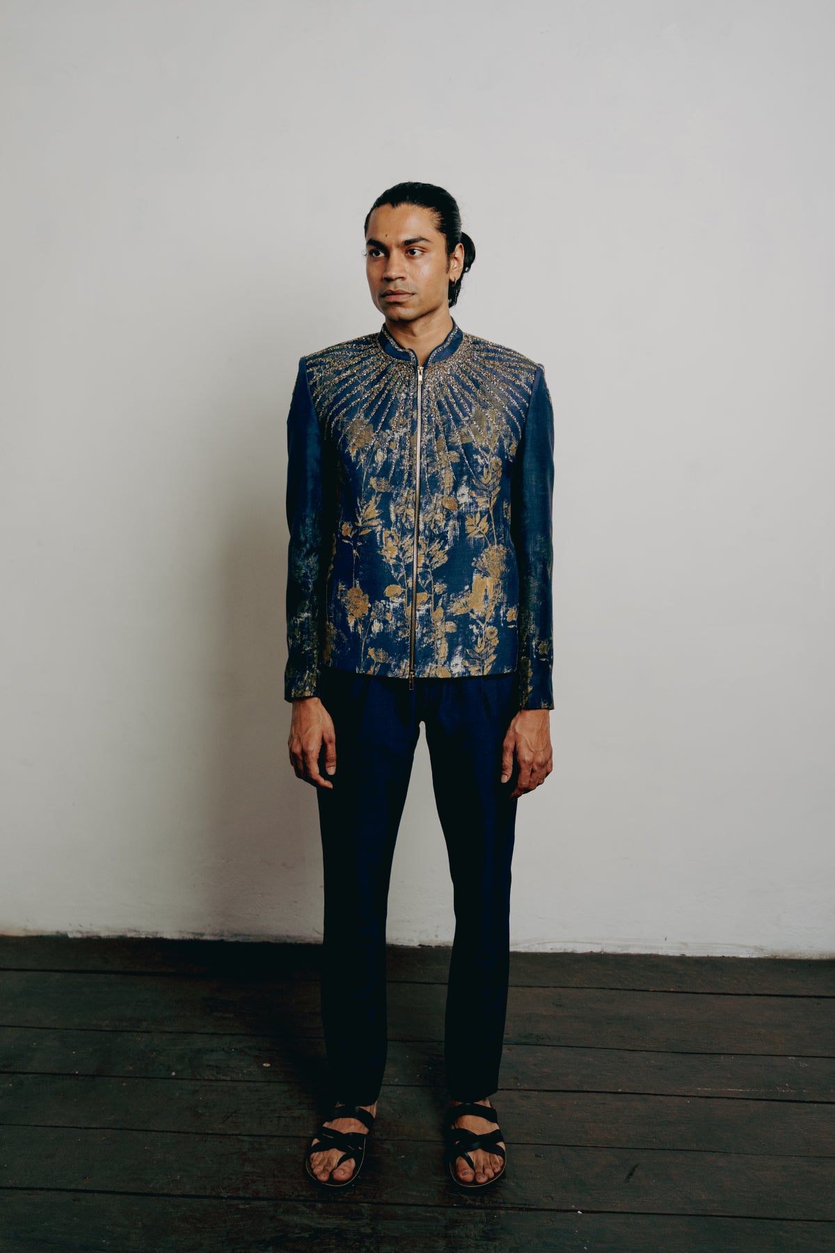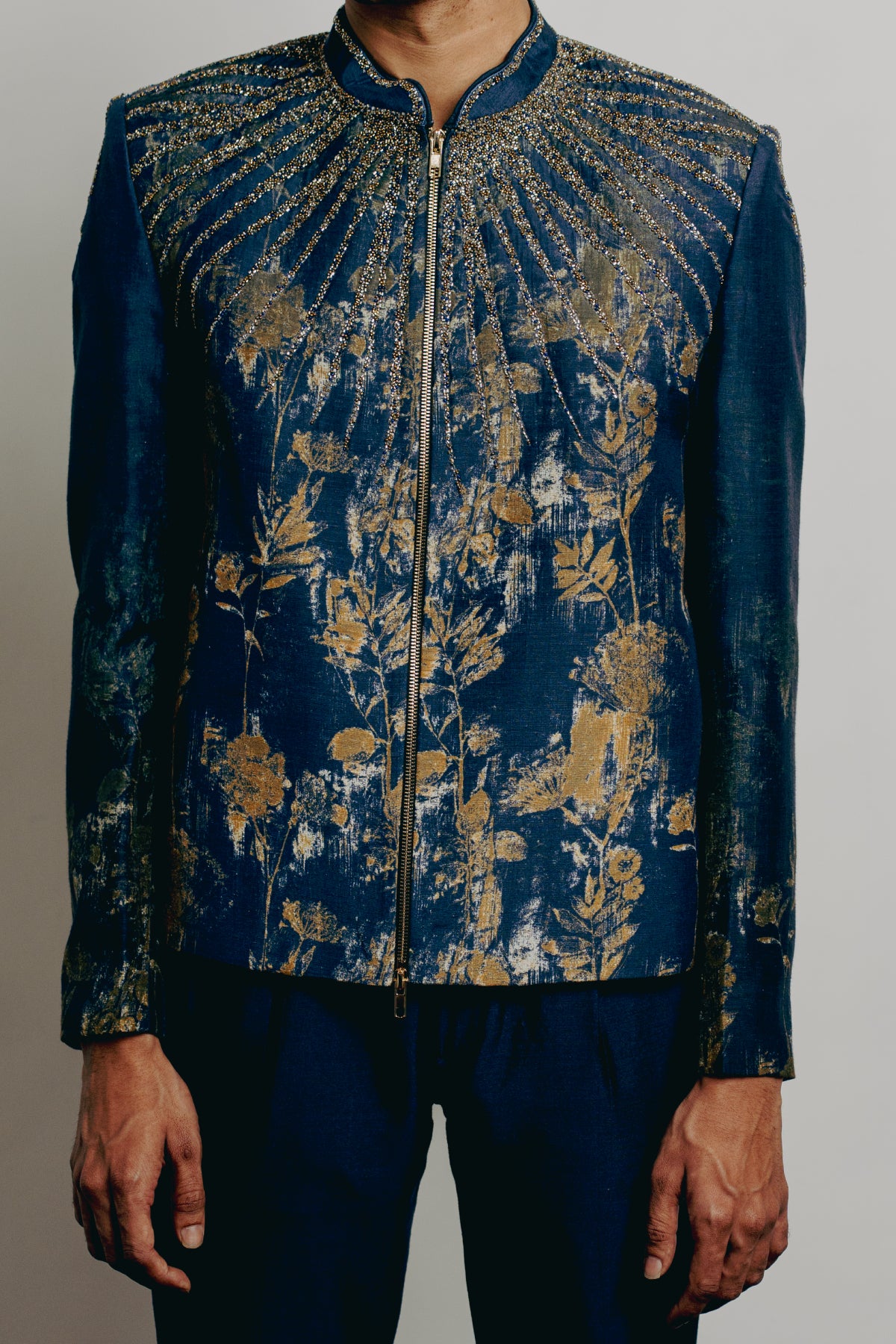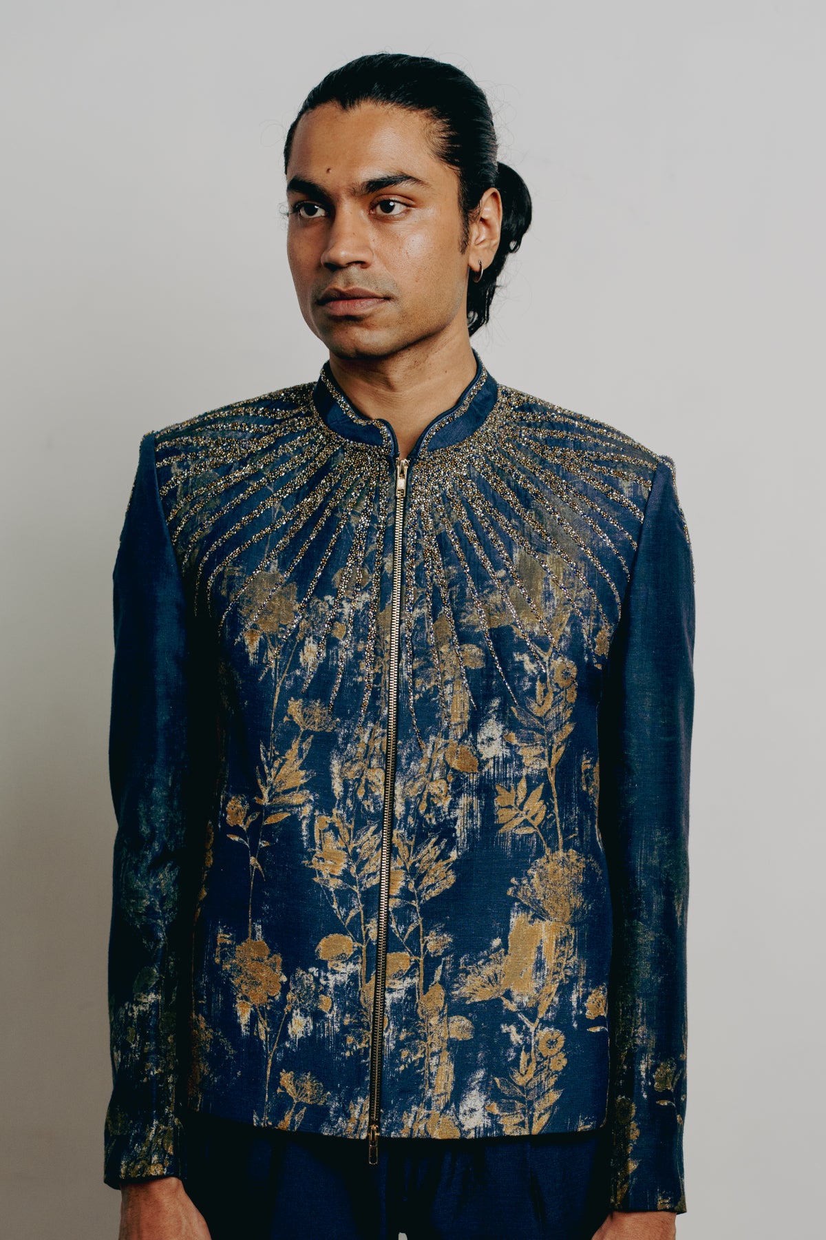 A navy bomber jacket adorned with hand-embroidered asymmetrical sun patterns, featuring beads and crystals on both the front and back, offers a striking fusion of artistic detailing and contemporary style.