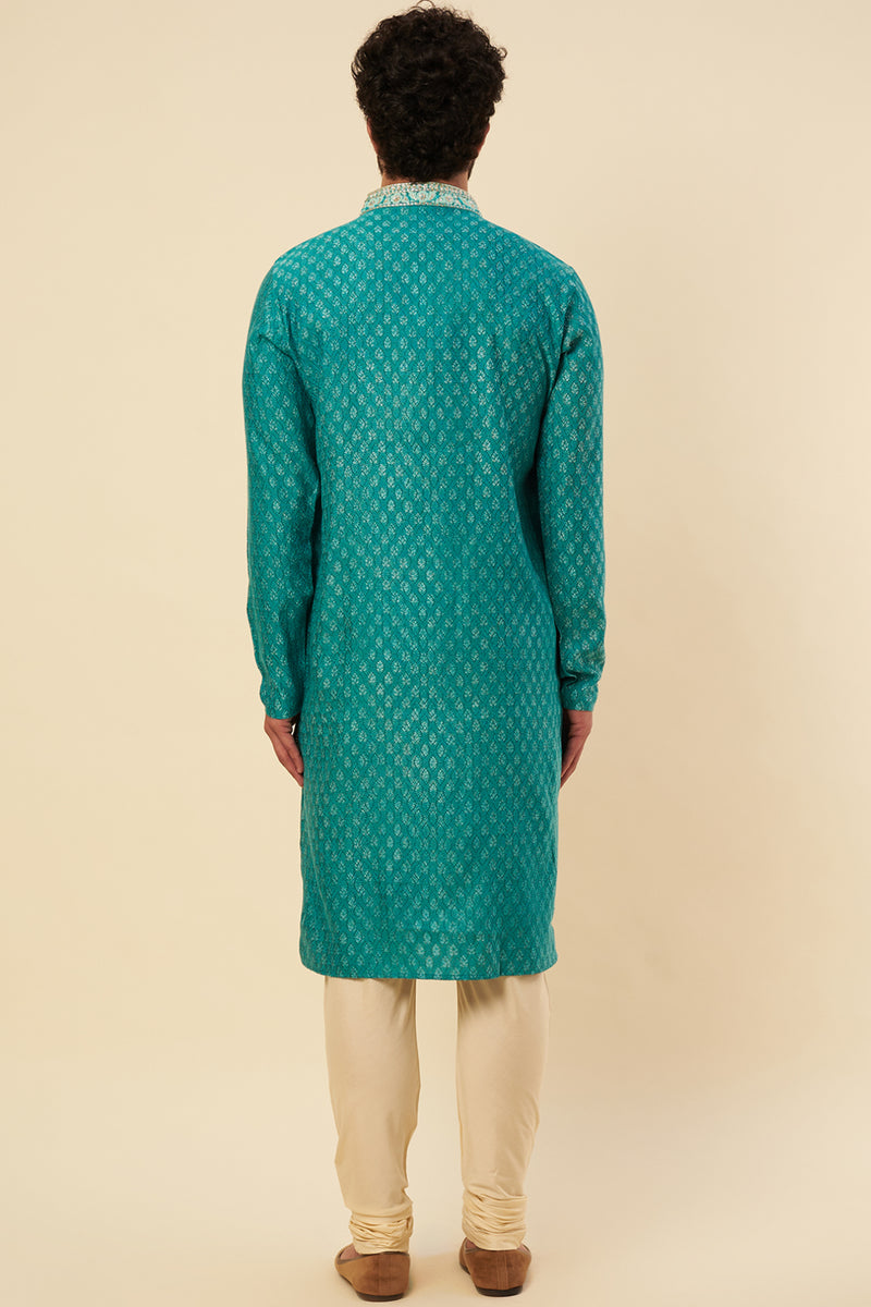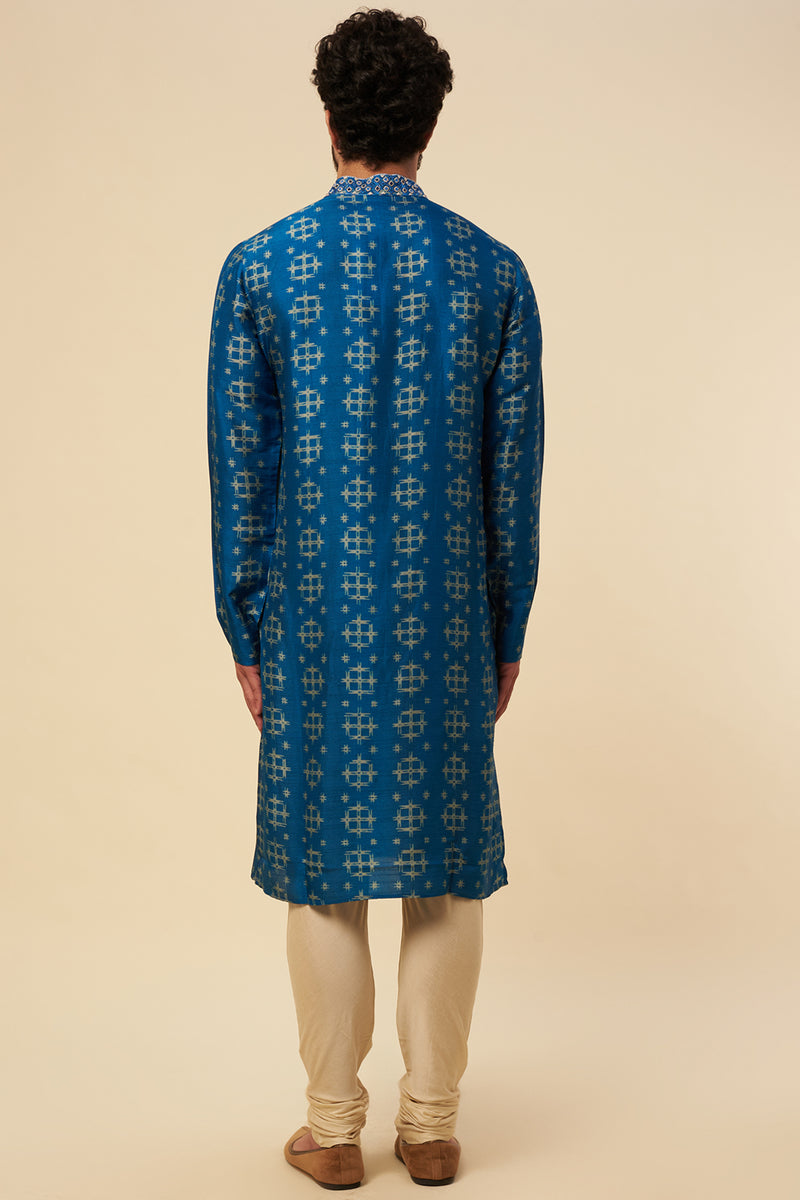 Turquoise & Indigo Tussar Hand Block Printed Kurta Set