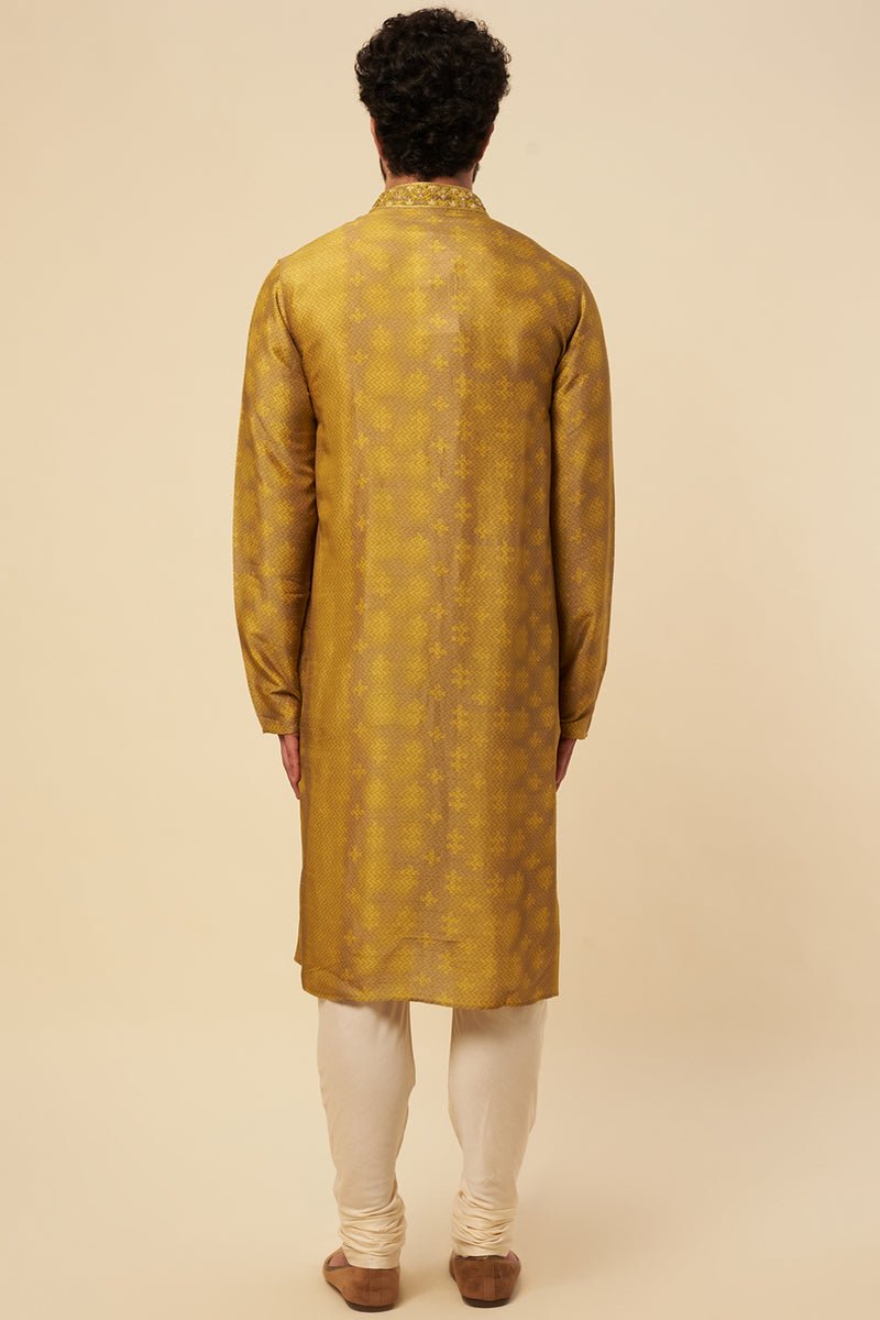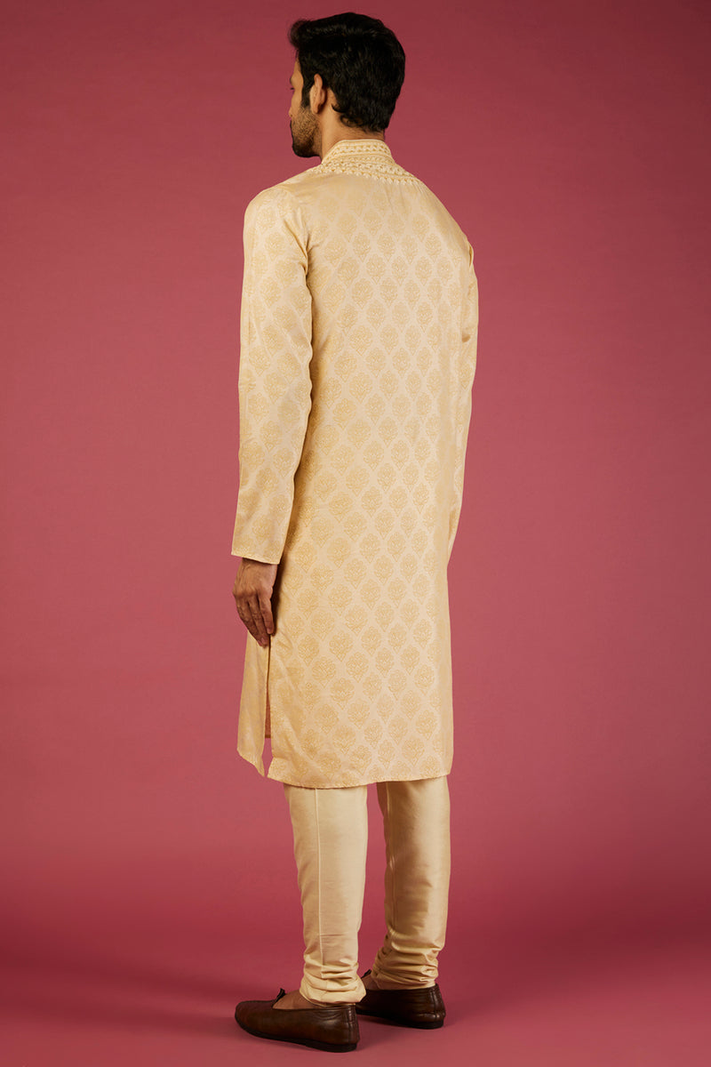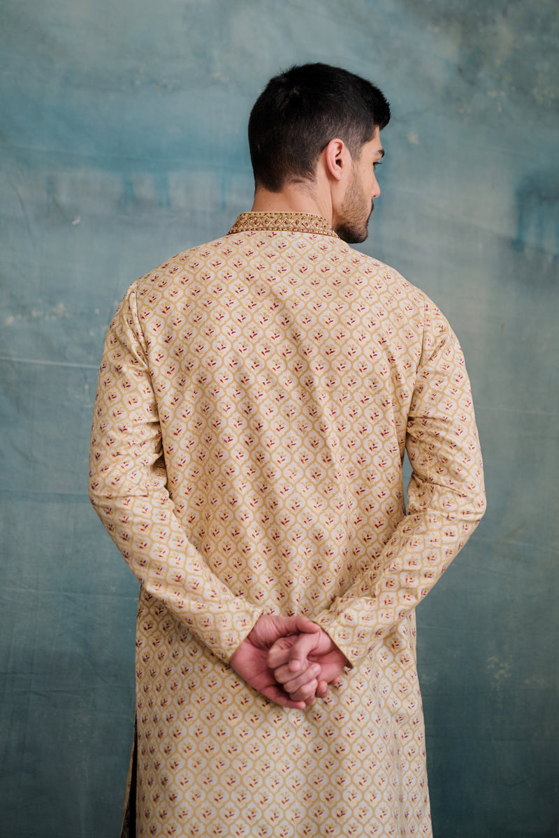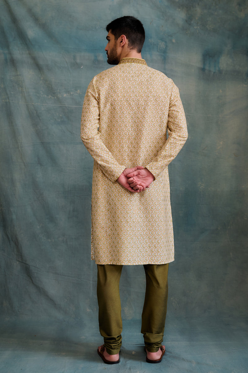 Gold Tussar Block Printed & Zardosi Embroidered Kurta Set