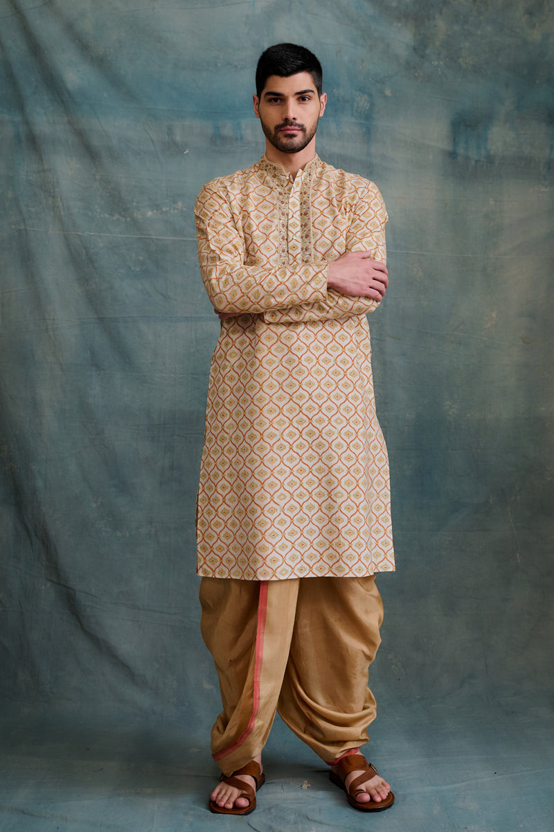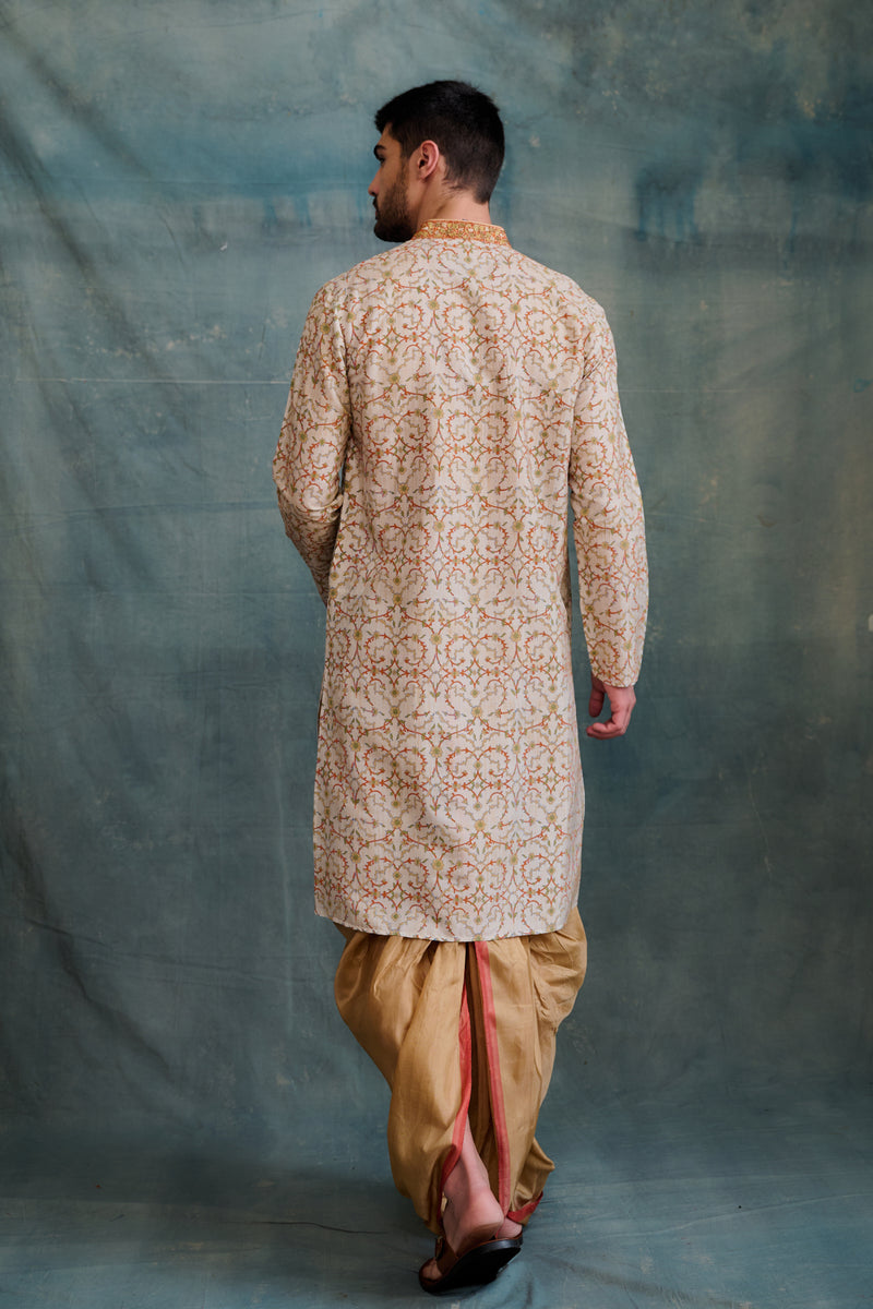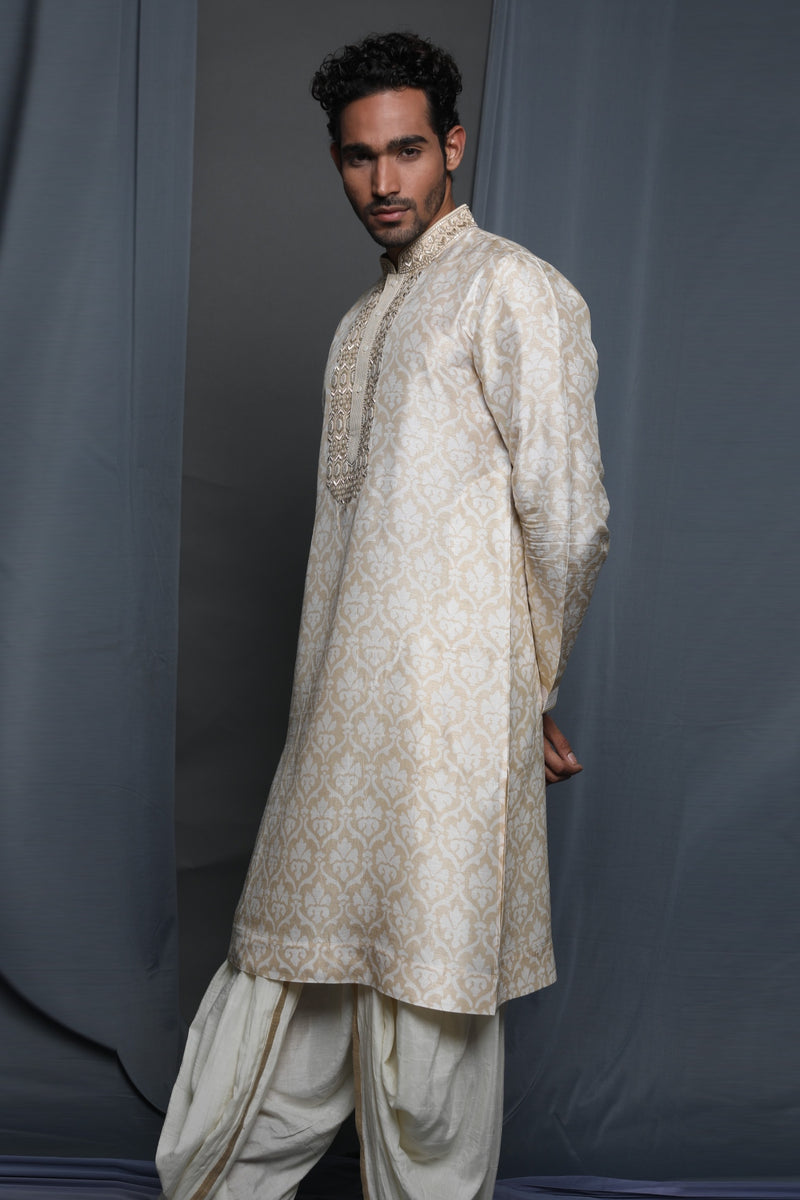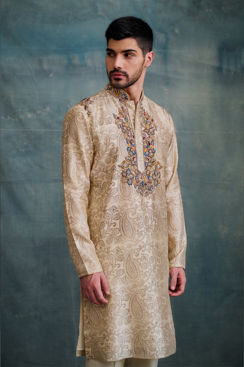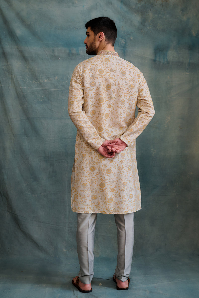 Beige Tussar Printed & Embroidered Kurta