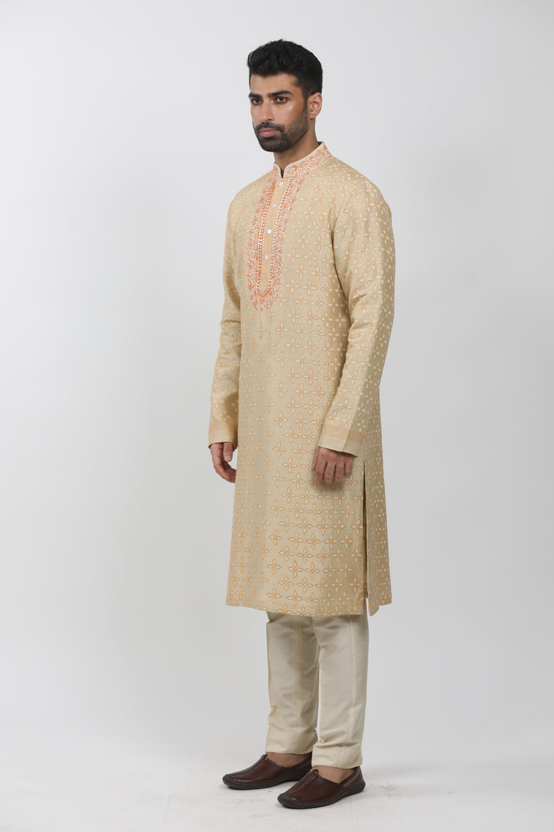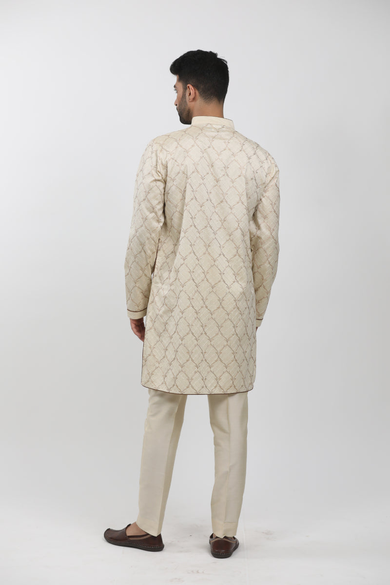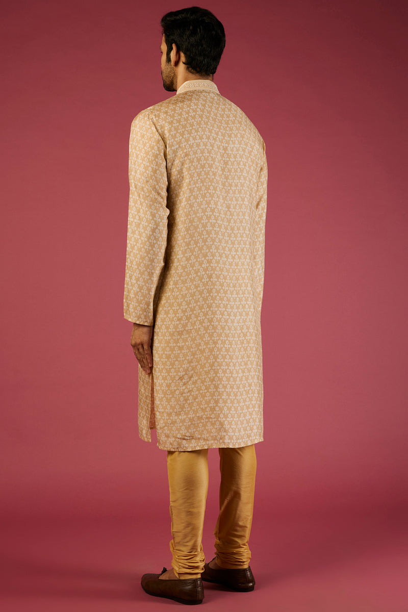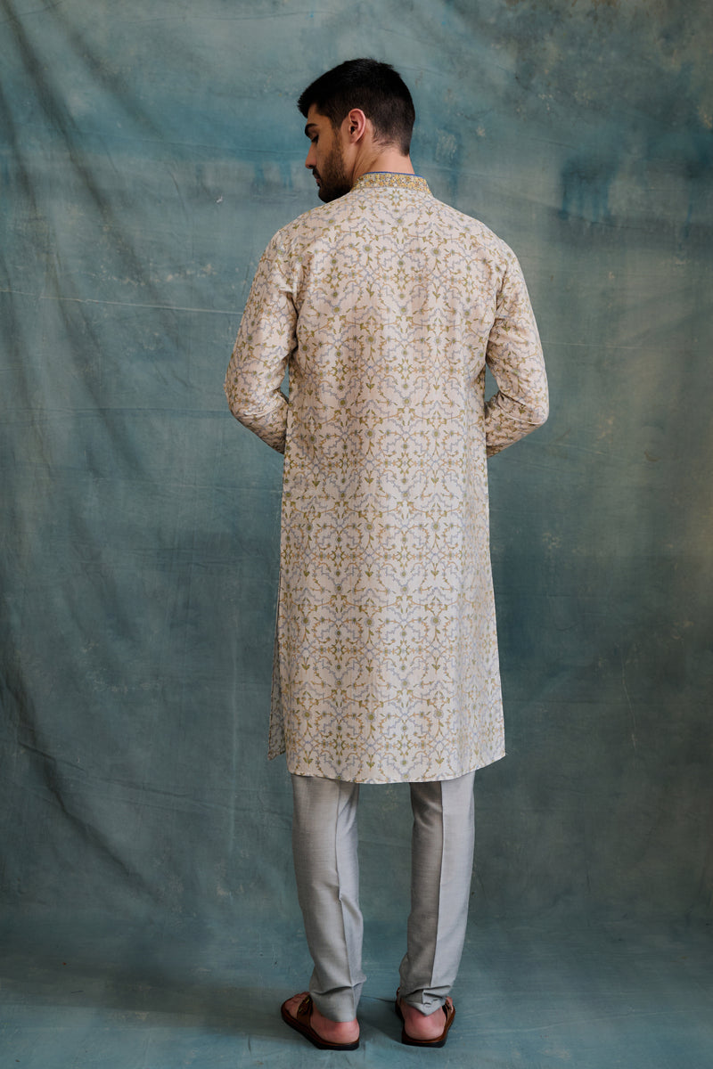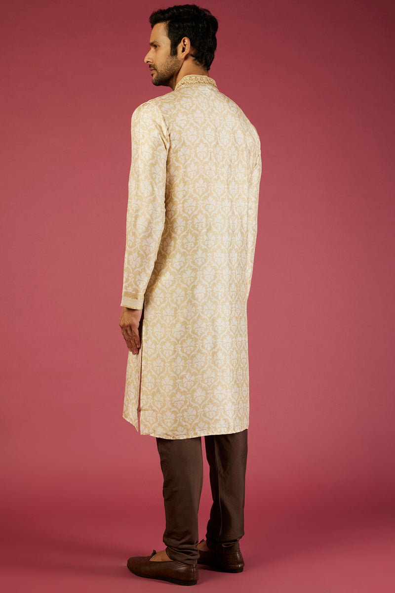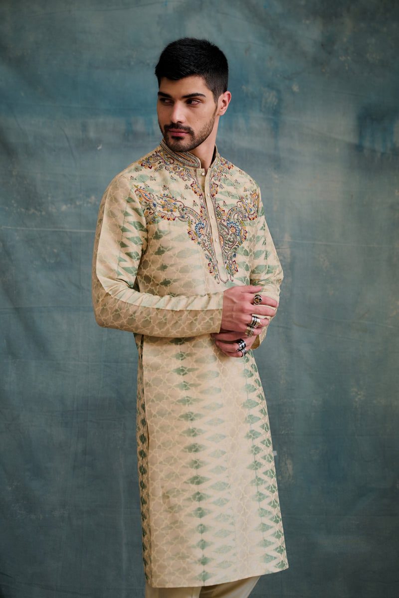 Beige Tussar Printed & Embroidered Kurta