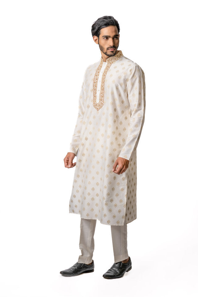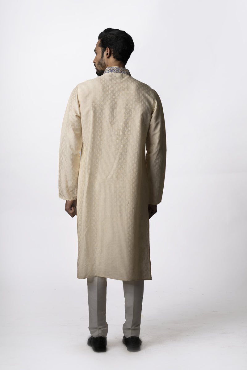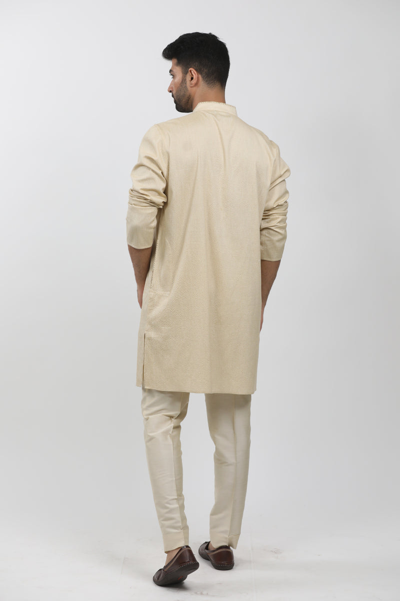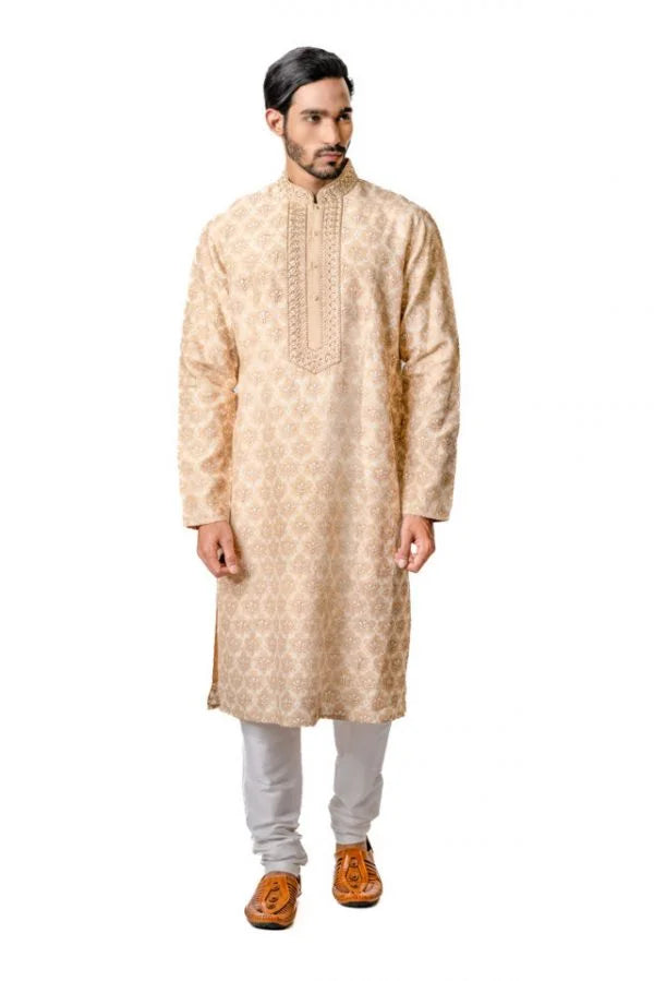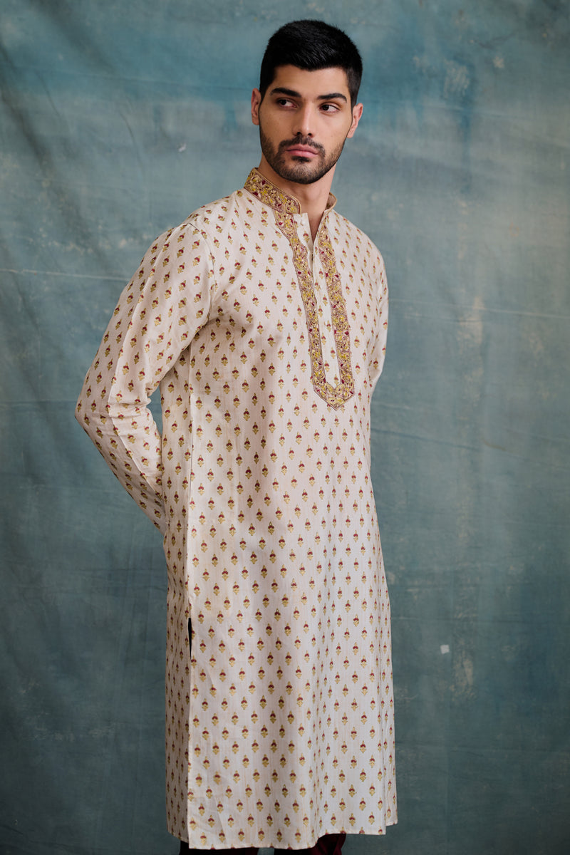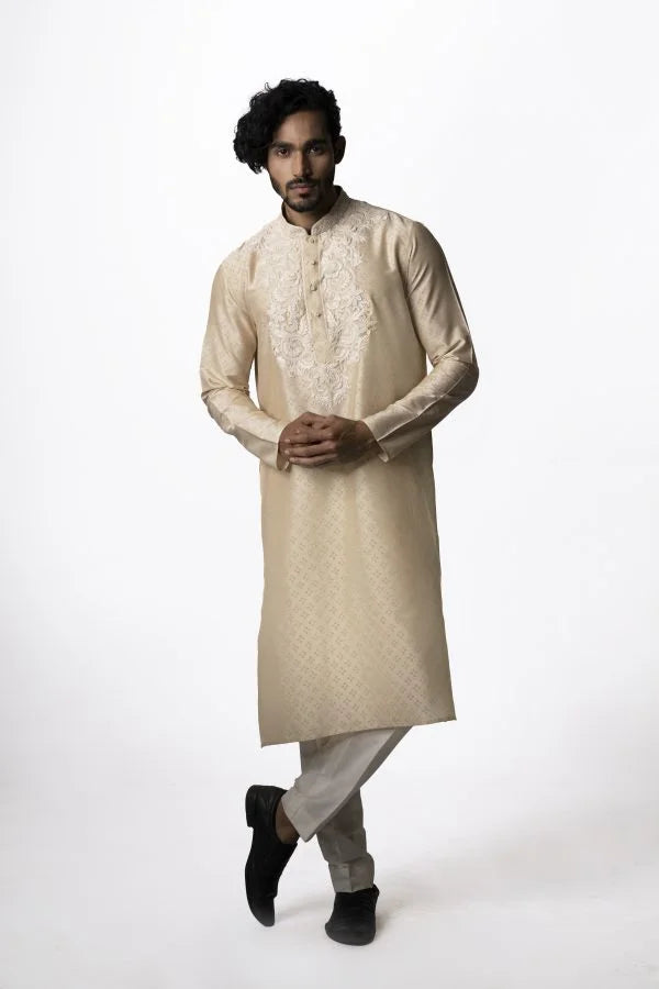 Beige Tussar Printed & Embroidered Kurta