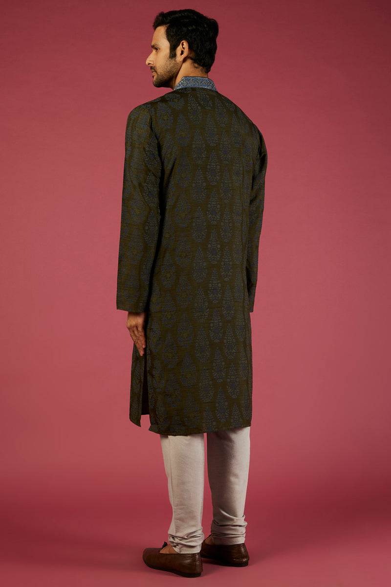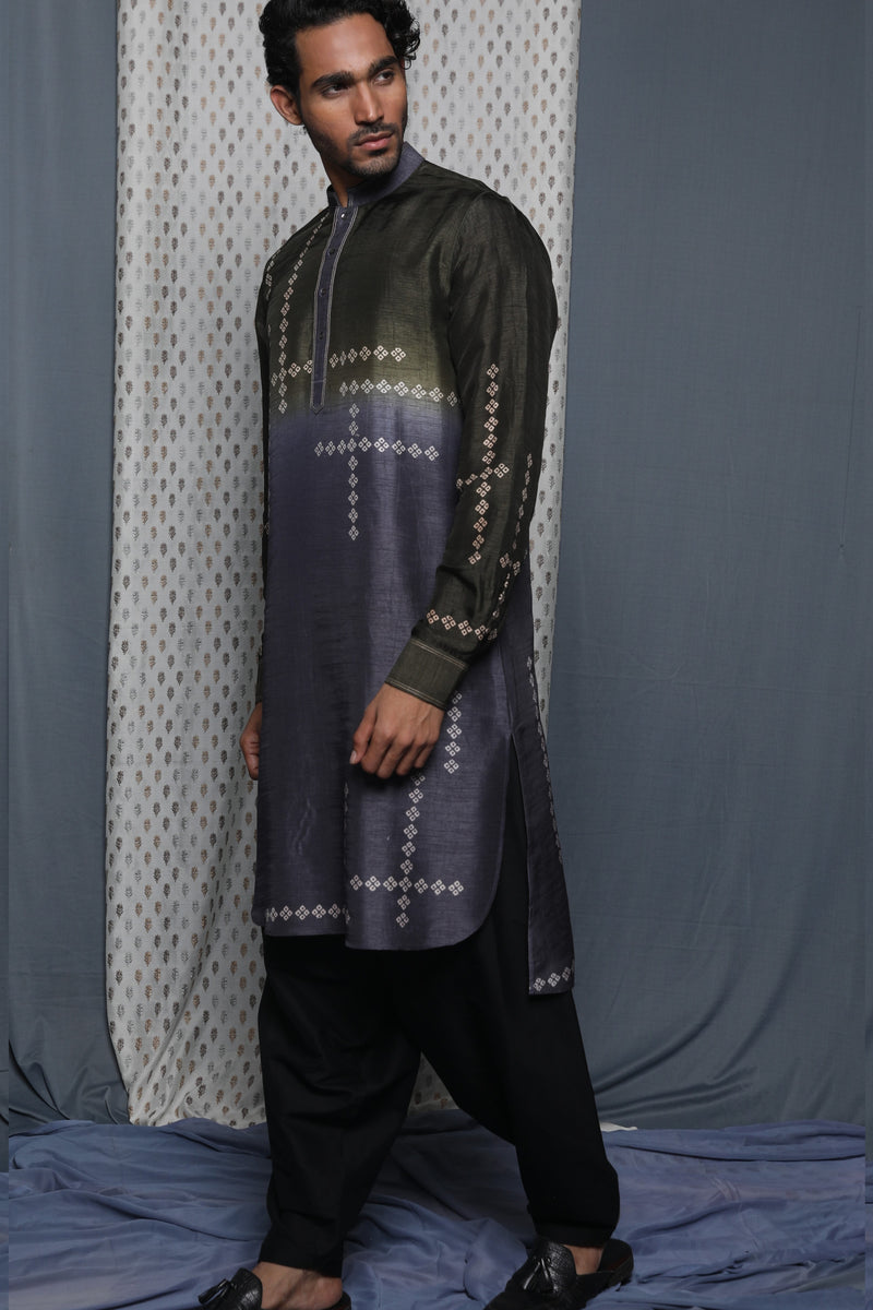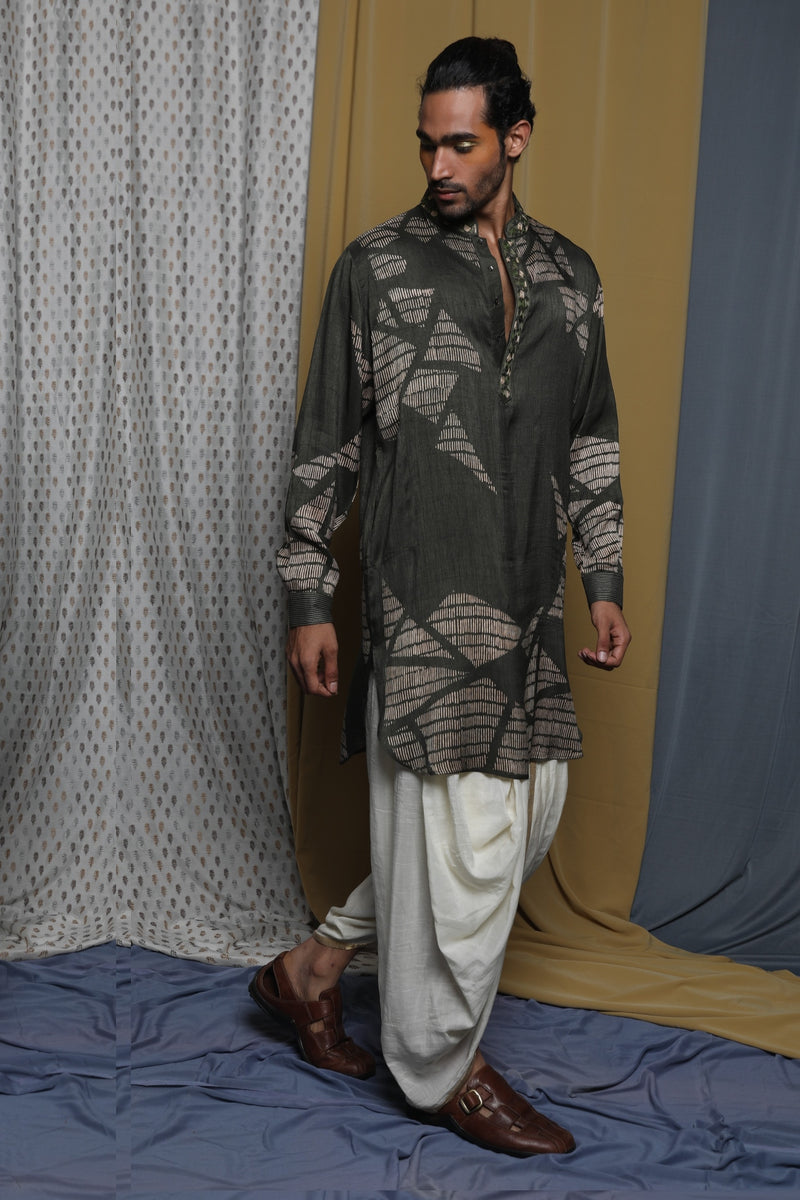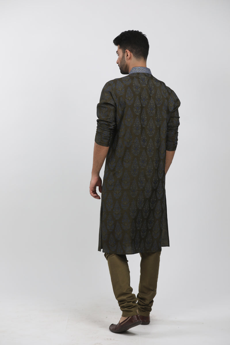 Olive & Grey Silk Block Printed Kurta Set