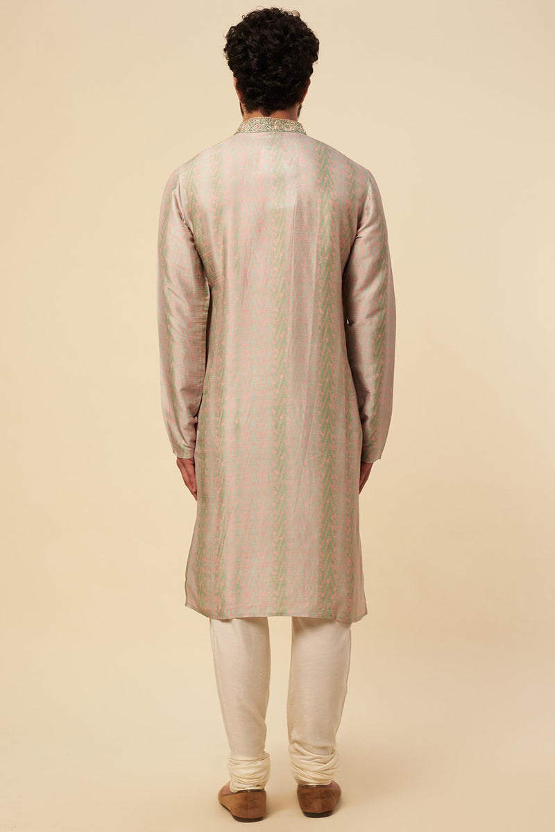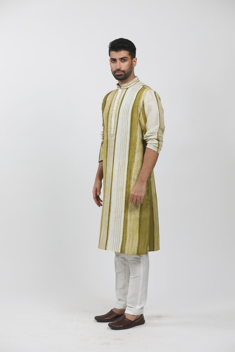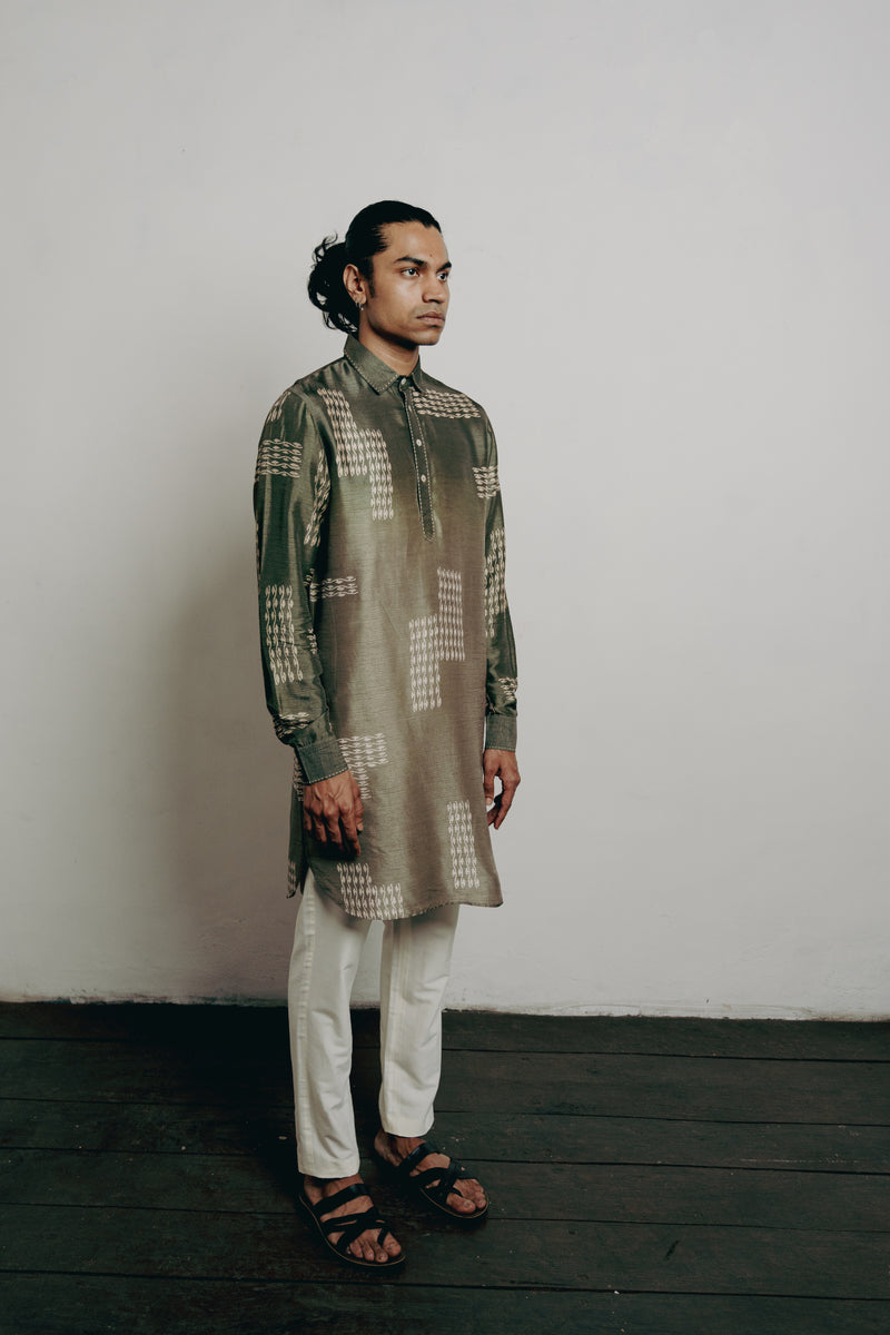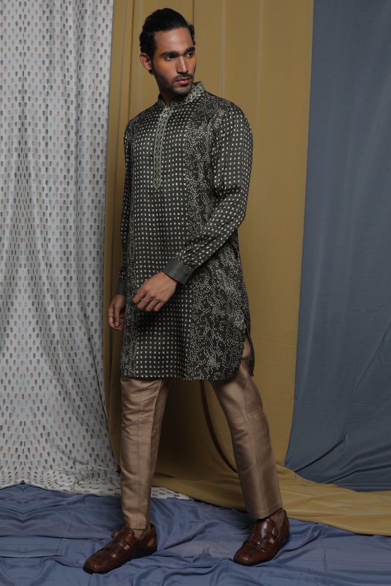 Olive & Grey Silk Block Printed Kurta Set
