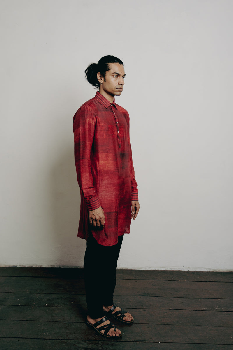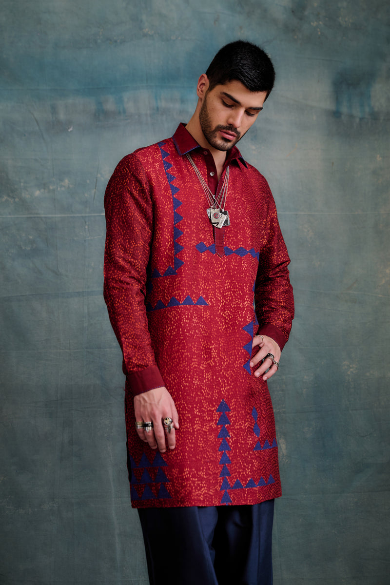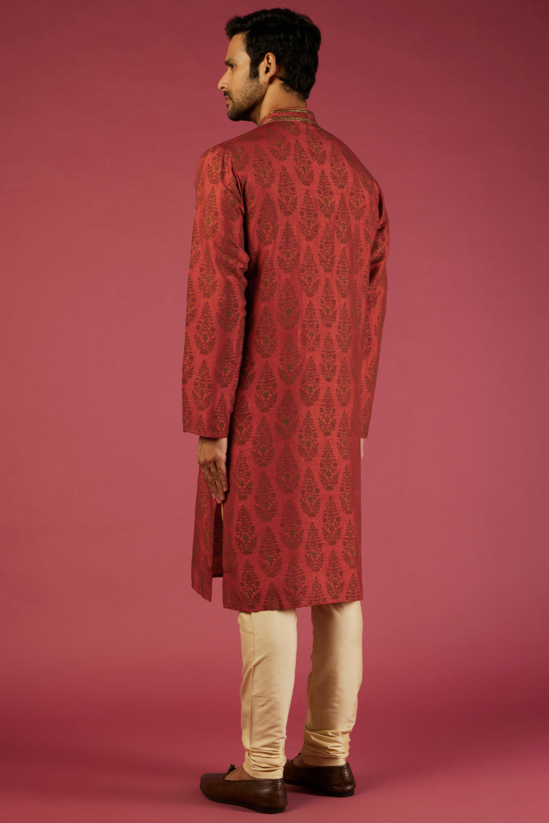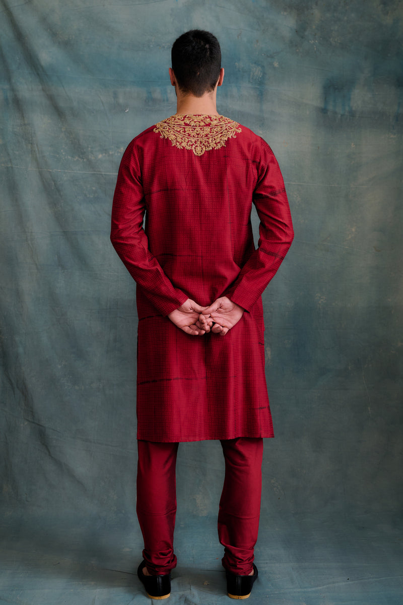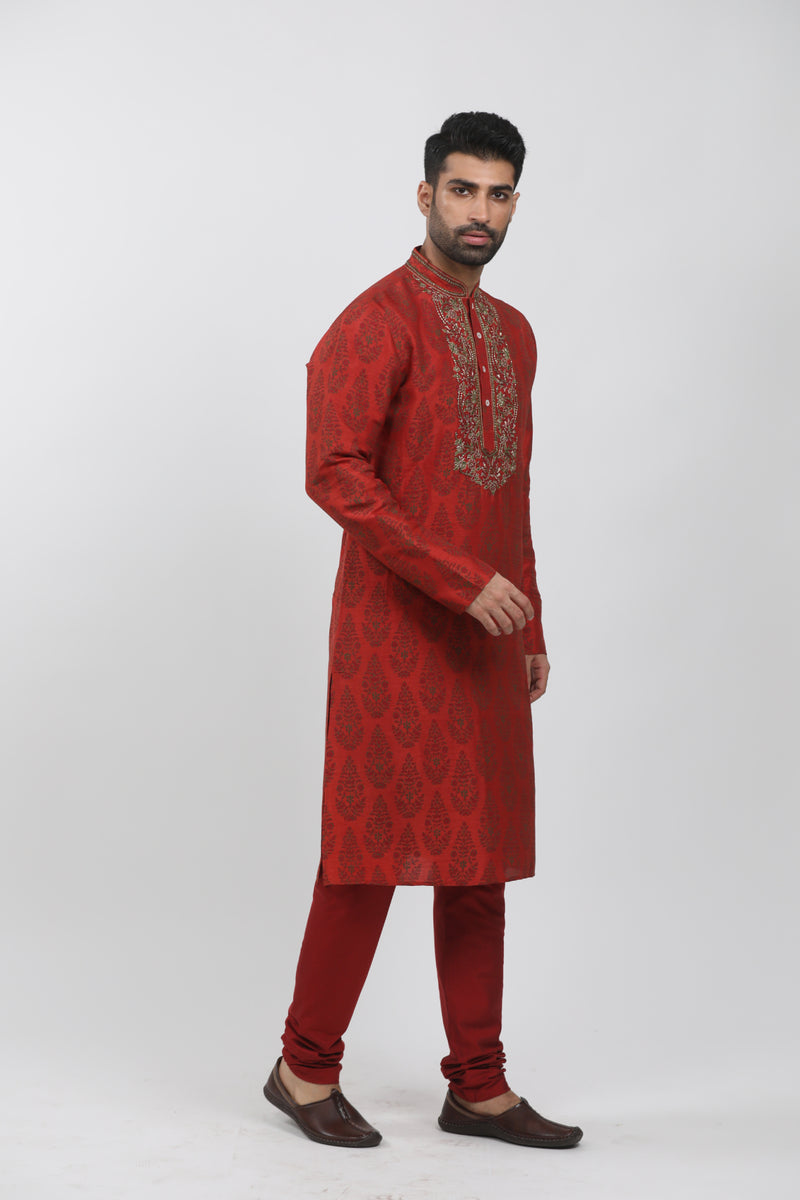 Red Tussar Block Printed & Marodi Hand Embroidered Kurta Set