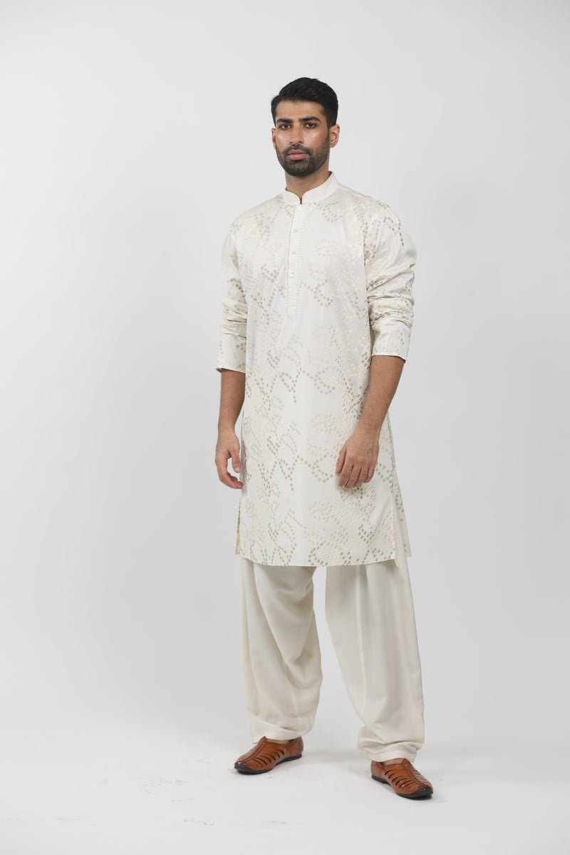 Beige Tie-Dye Tussar Block Printed & Zardosi Embroidered Kurta Set