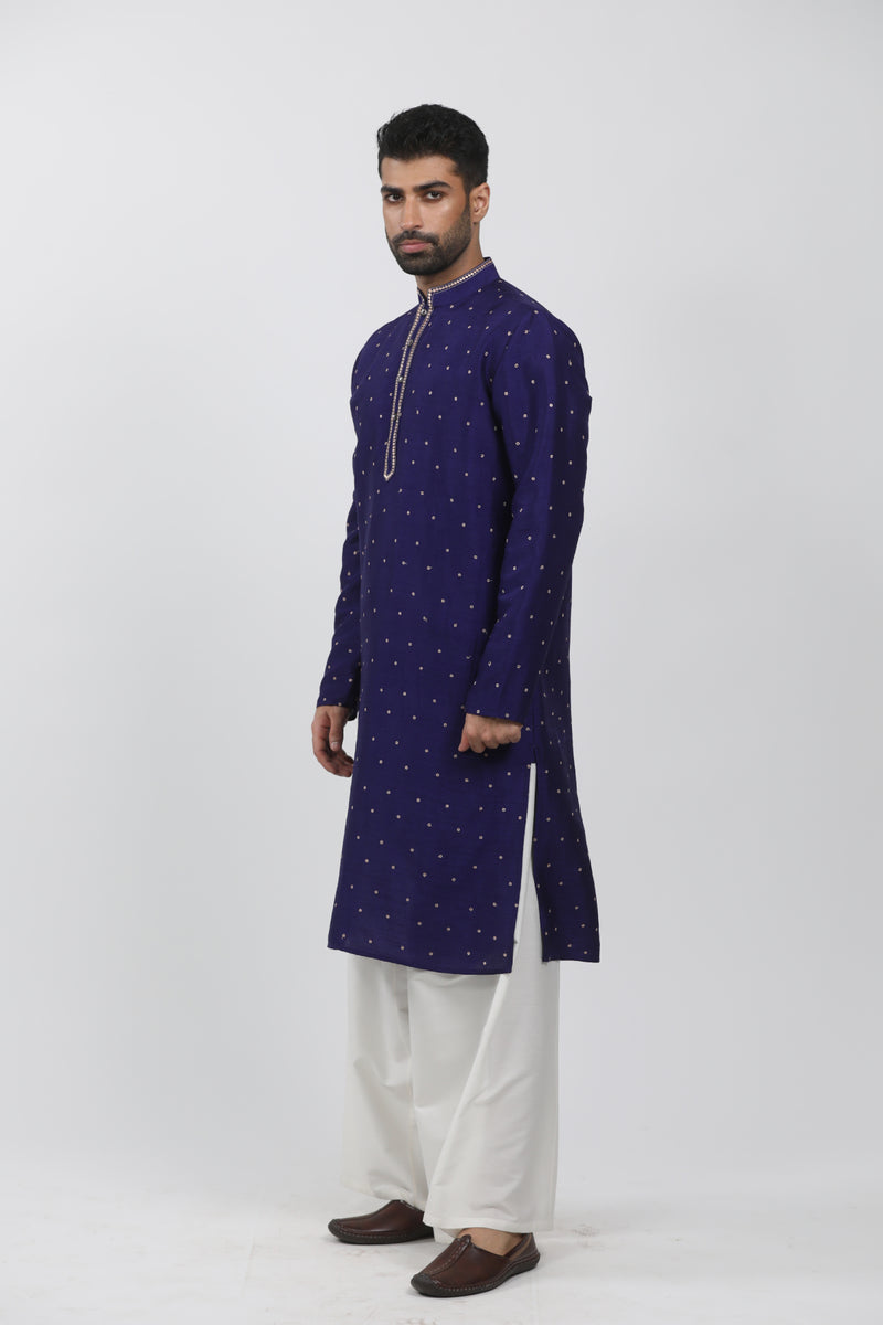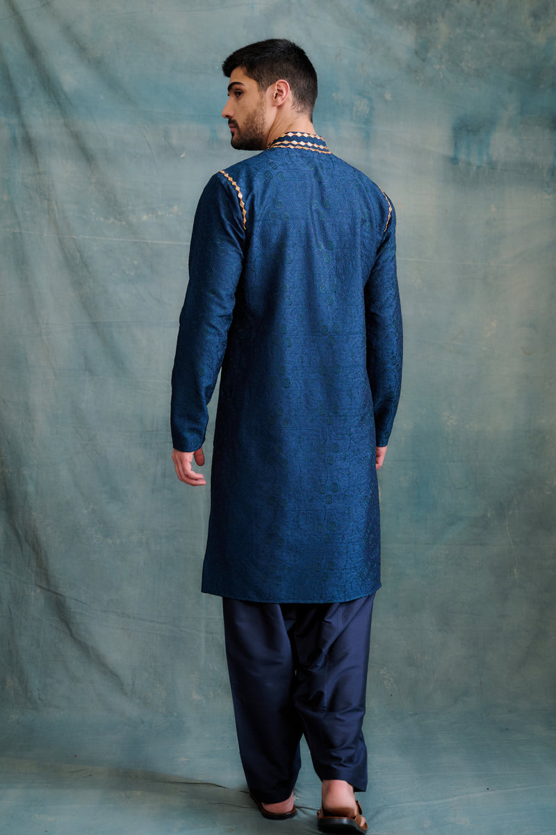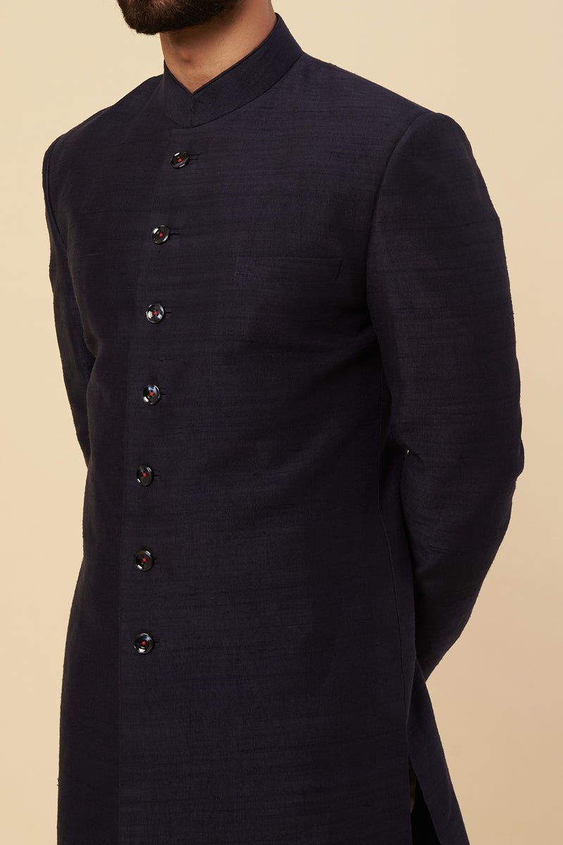 Navy Blue Raw Silk Zardosi Embroidered Sherwani Set