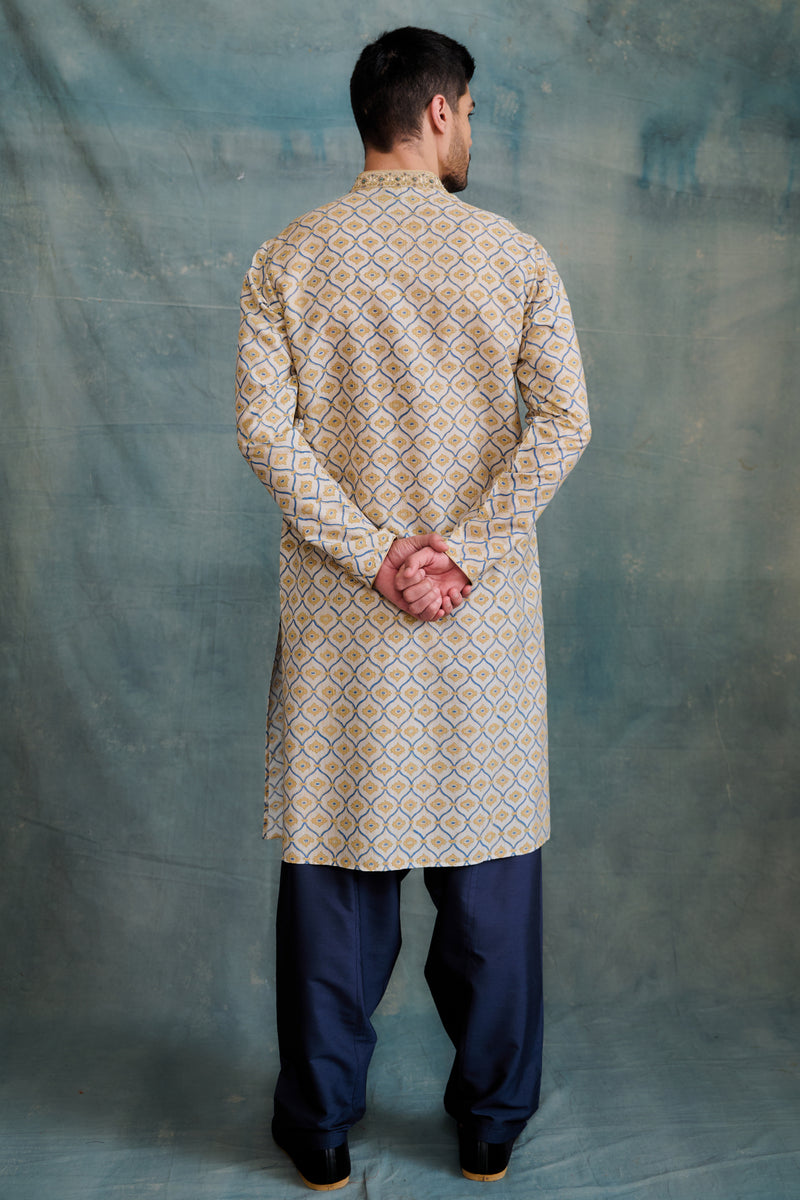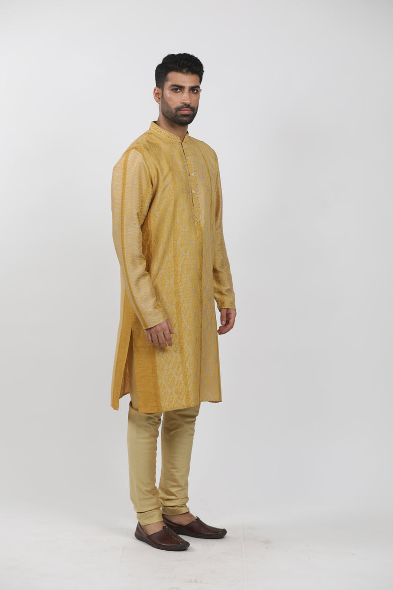 Gold-Yellow Tussar Block Printed & Zardosi Embroidered Kurta Set