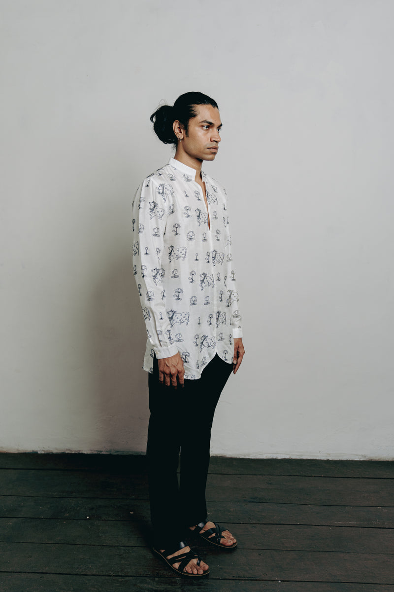 White All Over Lotus-Cow Embroidered Short Kurta