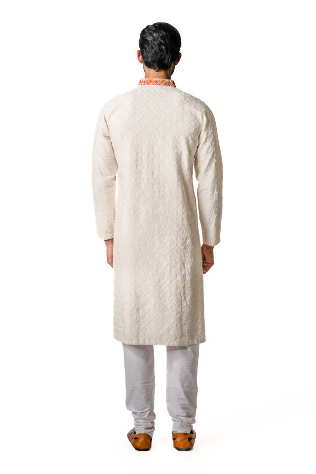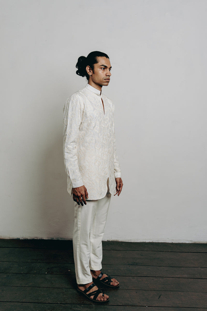 White Cotton Viscose Thread Embroidered Short Kurta