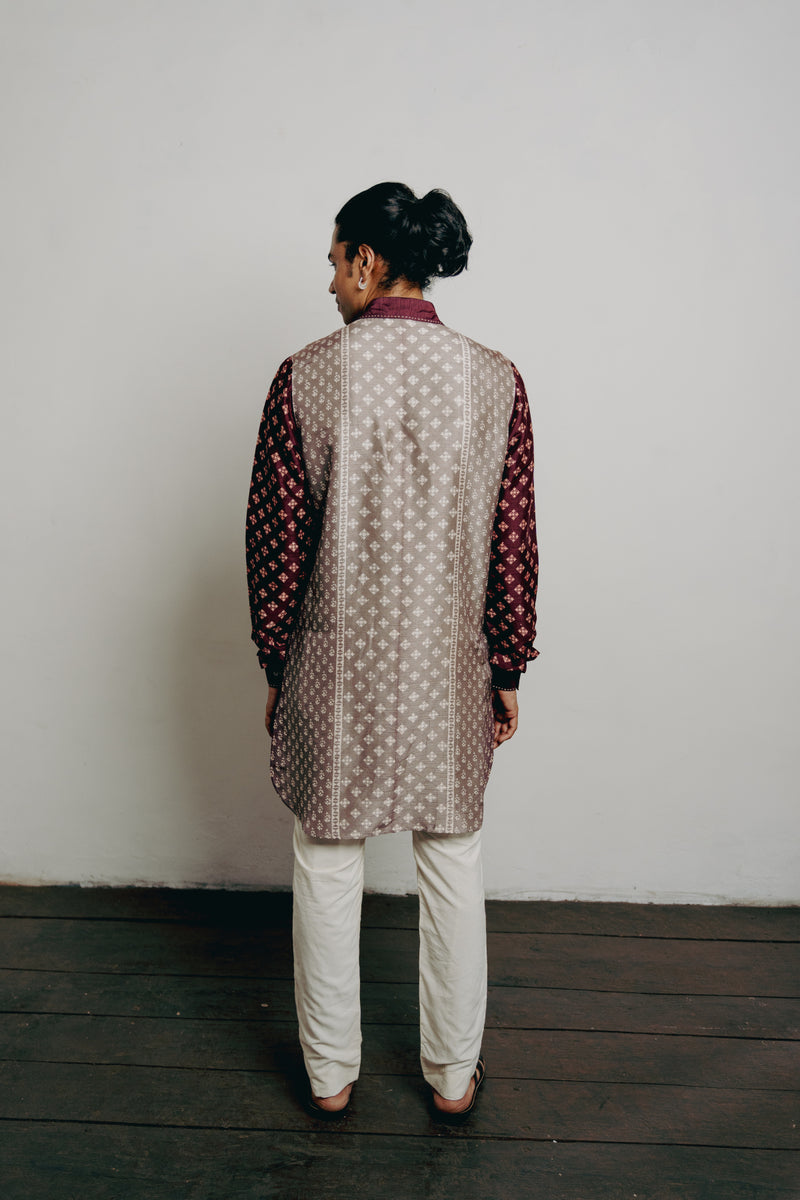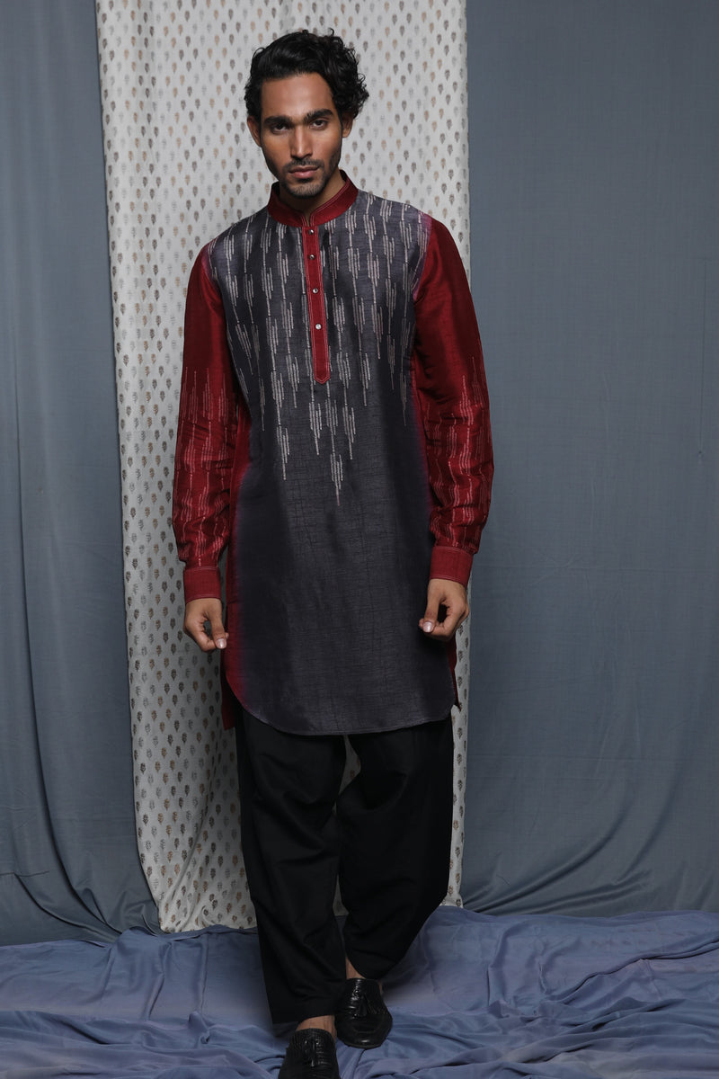 Grey & Maroon Tussar Block Printed Kurta Set
