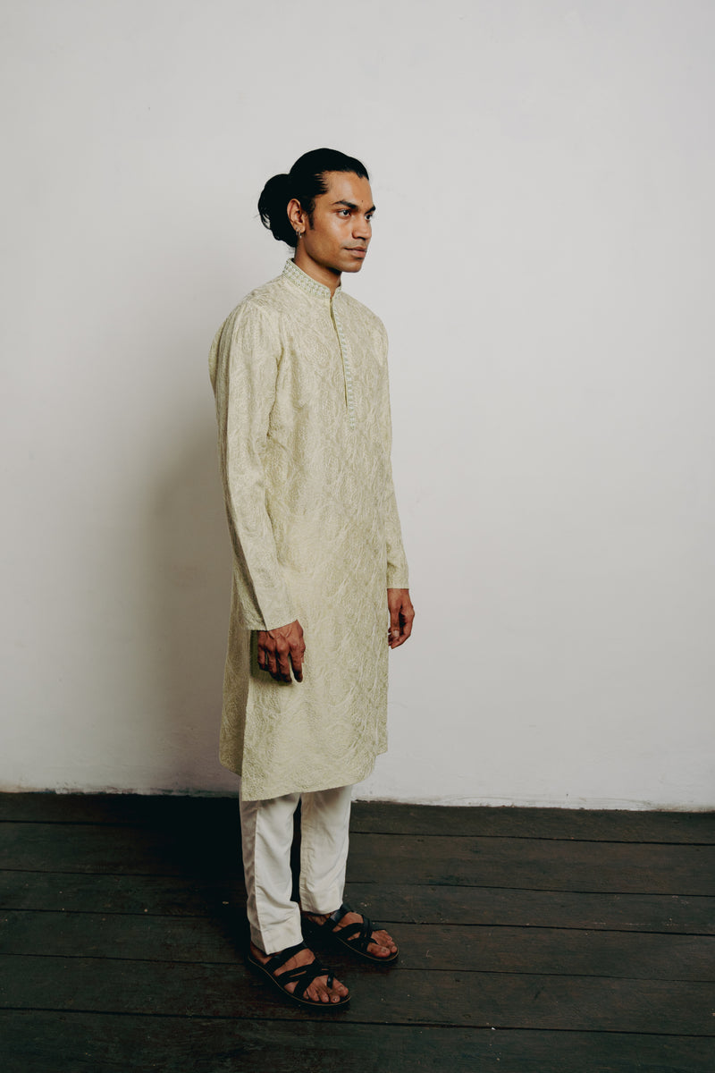 Light Green Tussar Cord & Mirror Embroidered Kurta Set