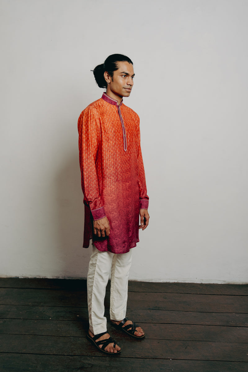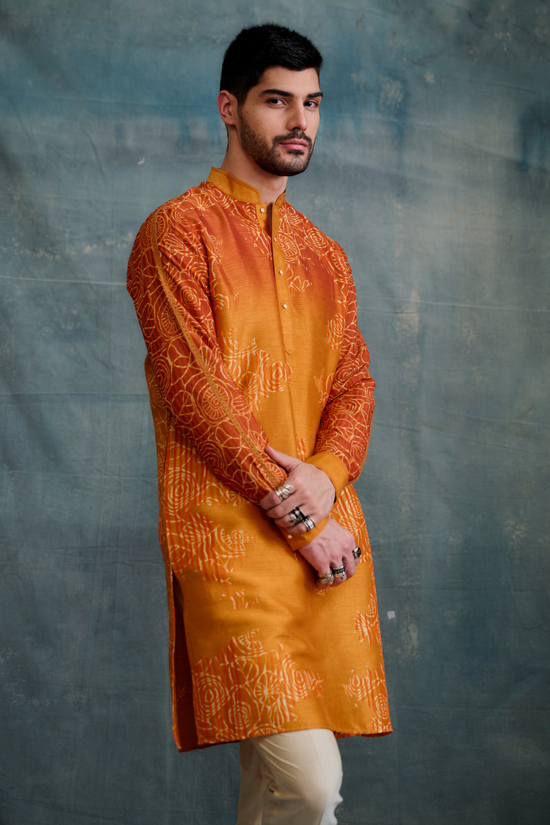 Orange Shaded Tussar Block Printed Kurta Set