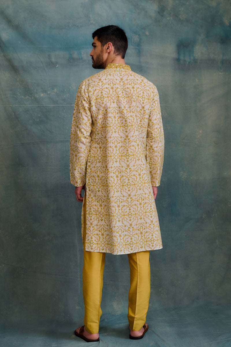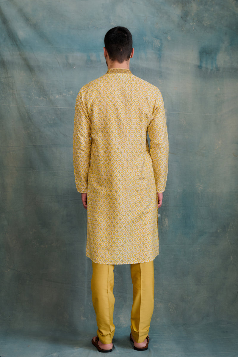 Yellow Tussar Block Printed & Zardosi Embroidered Kurta Set