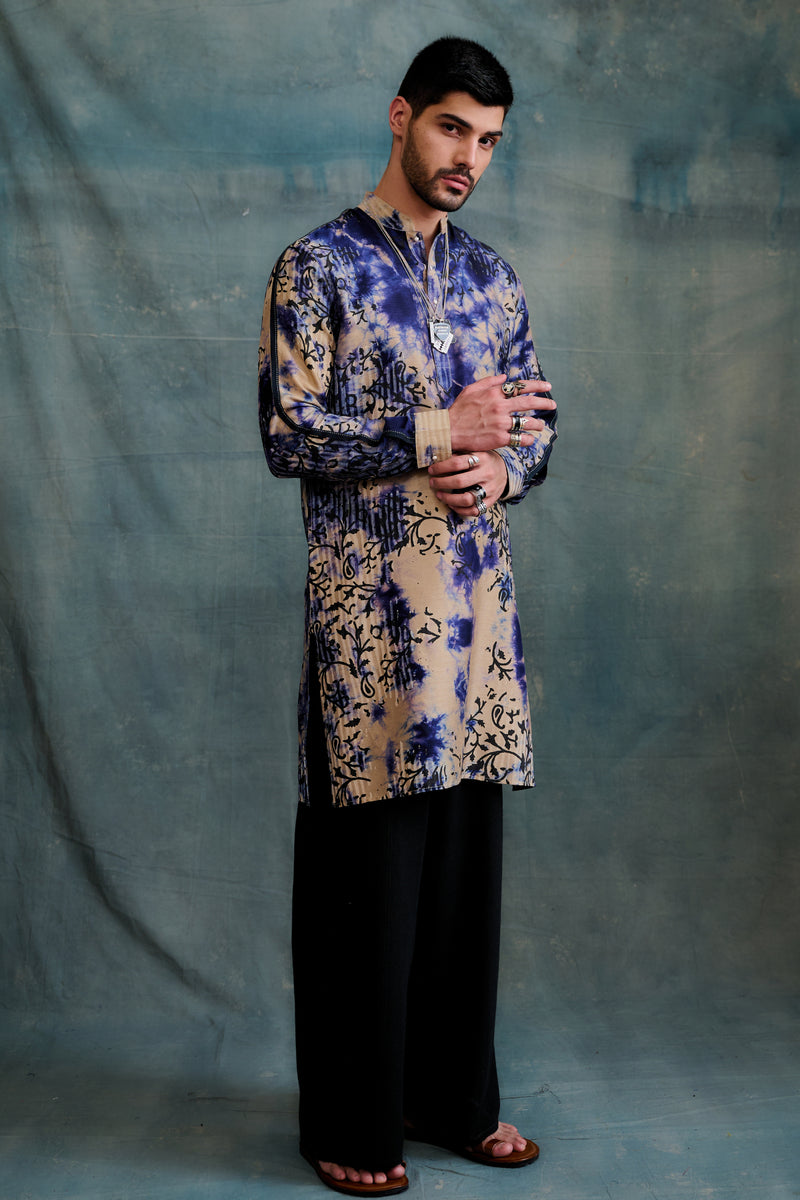 Beige & Blue Tie-Dye Tussar Floral Block Printed Kurta Set