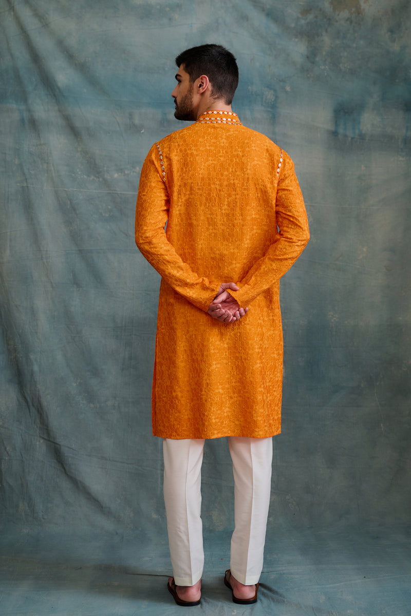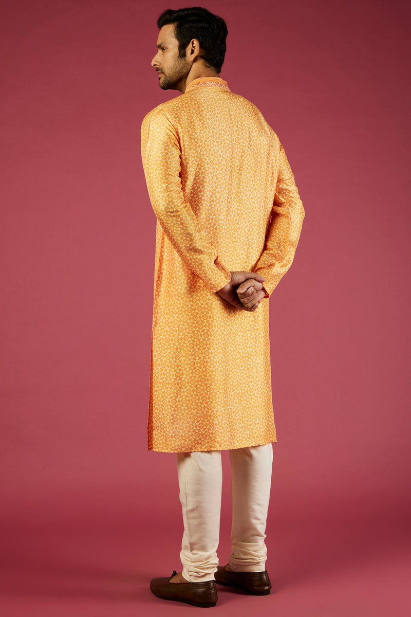 Orange Tussar Geometric Textured Printed Kurta Set