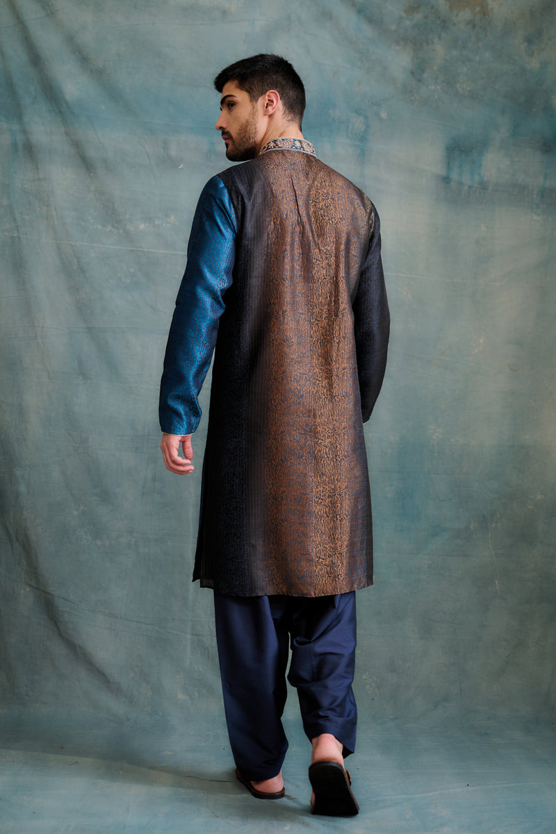 Brown-Blue Shaded Tussar Block Printed & Zardosi Embroidered Kurta Set
