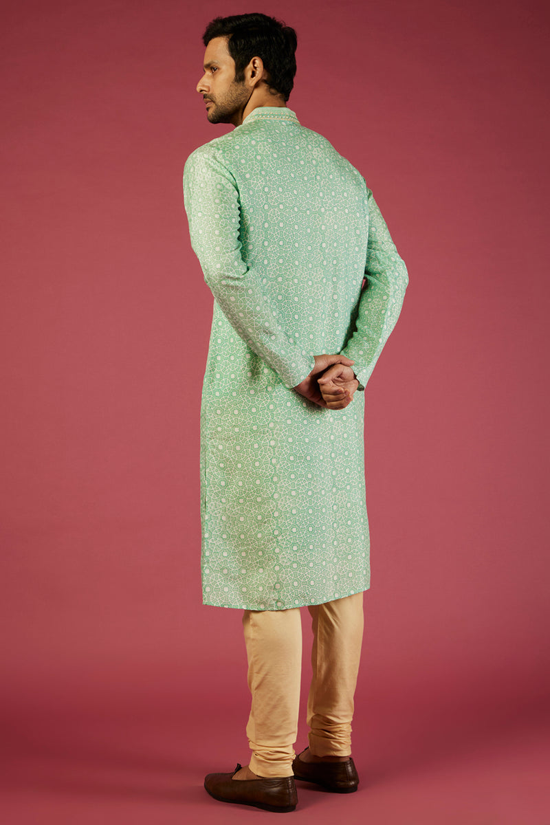 Pista Green Tussar Geometric Block Printed & Embroidered Kurta Set