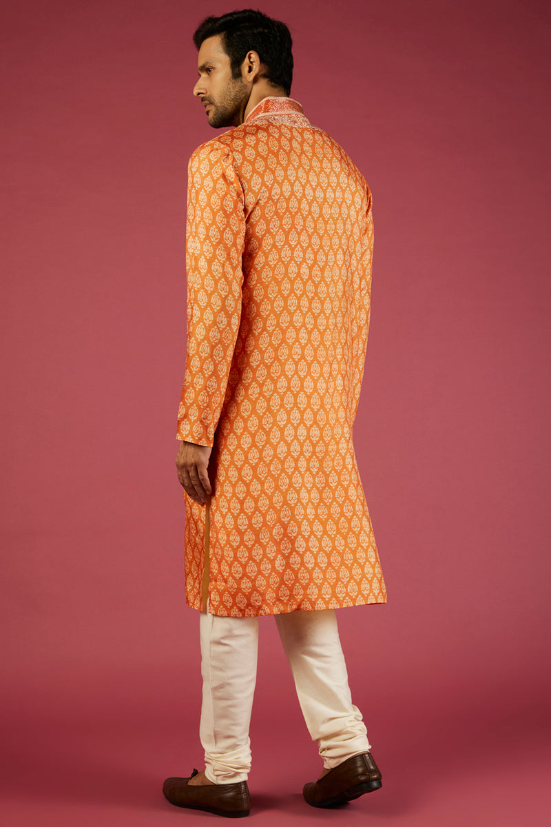 Orange-Shaded Tussar Block Printed Kurta Set