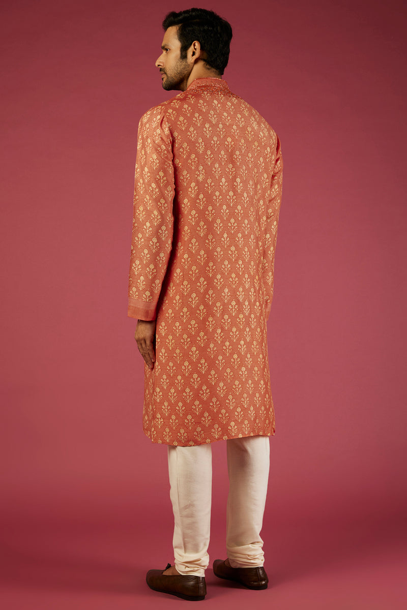 Peach Tussar Floral Printed & Embroidered Kurta Set