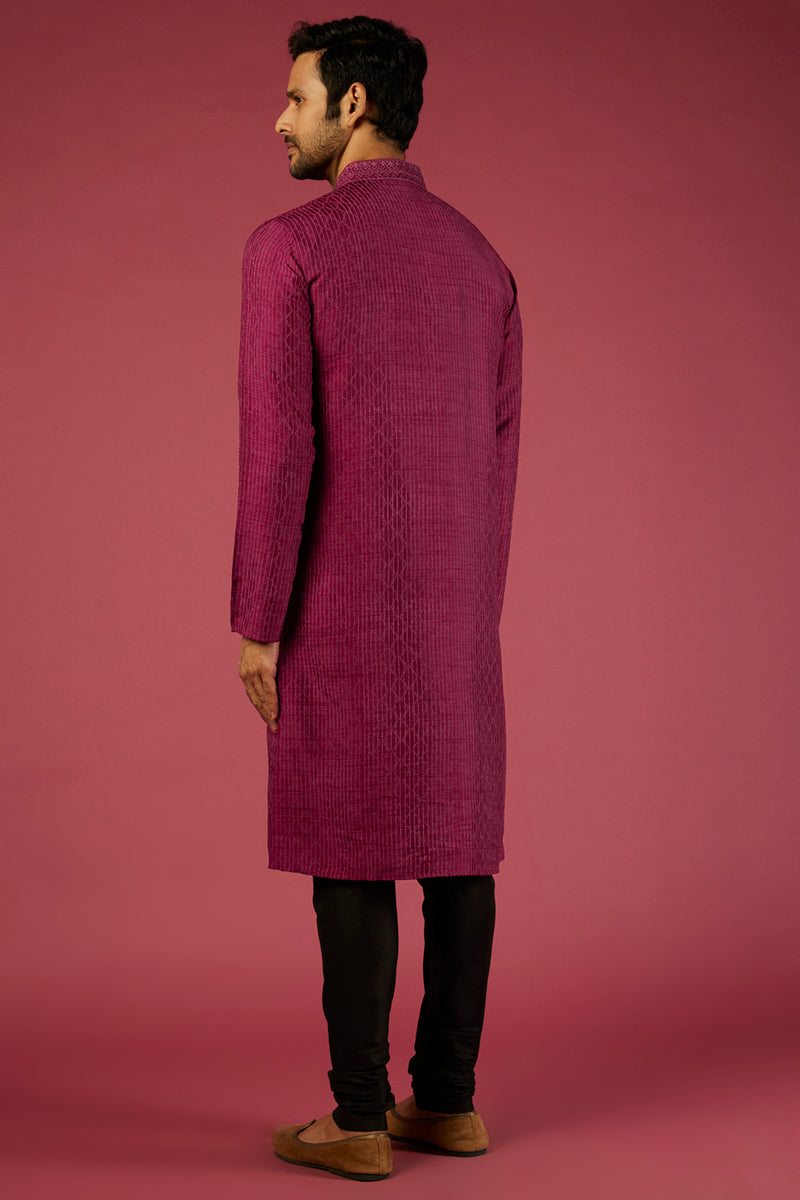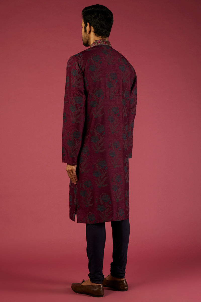 Magenta Tussar Block Printed & Hand Embroidered Kurta Set