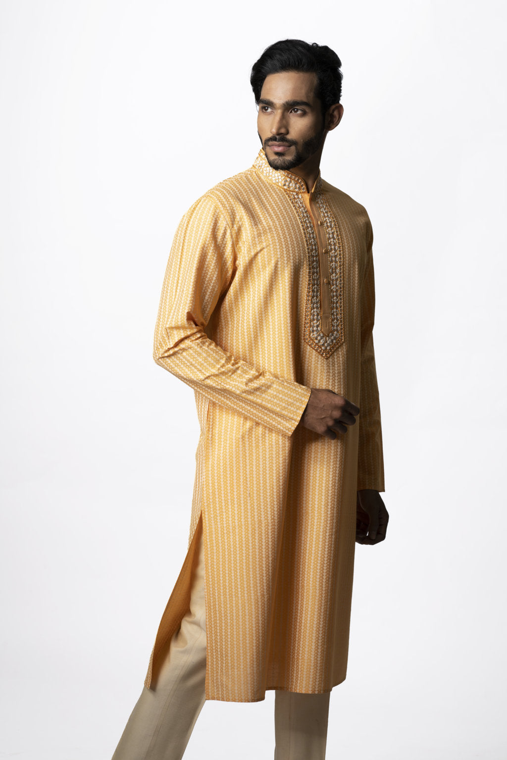 Featuring a Mango kurta in viscose cotton base with block print and gotta hand embroidery. It is paired with contrasting churidar pants.