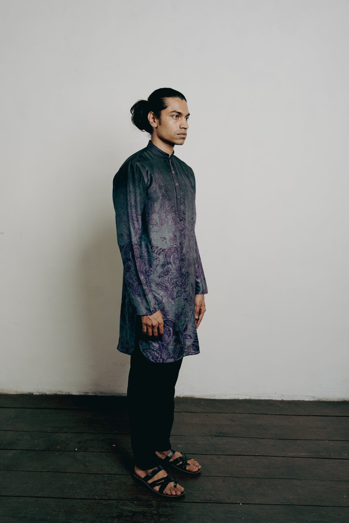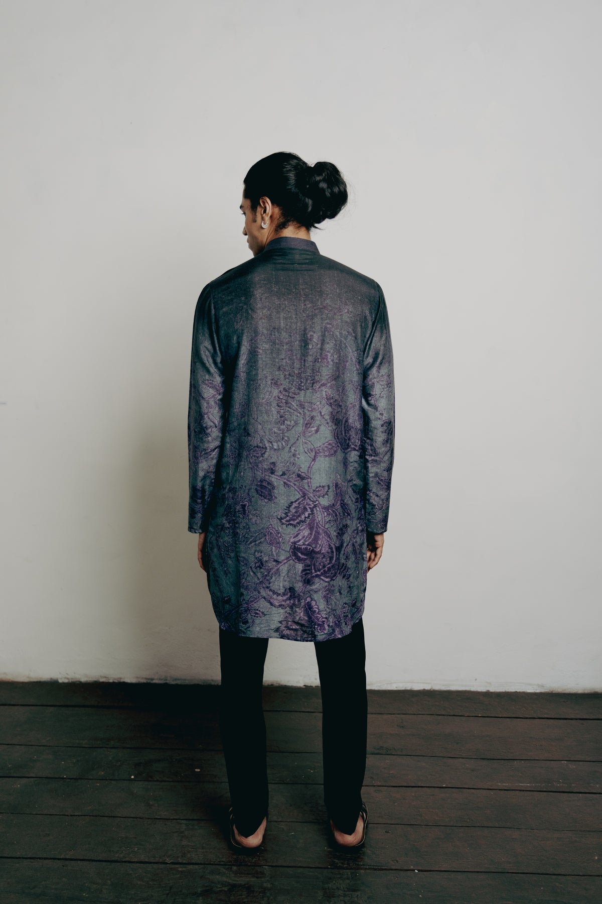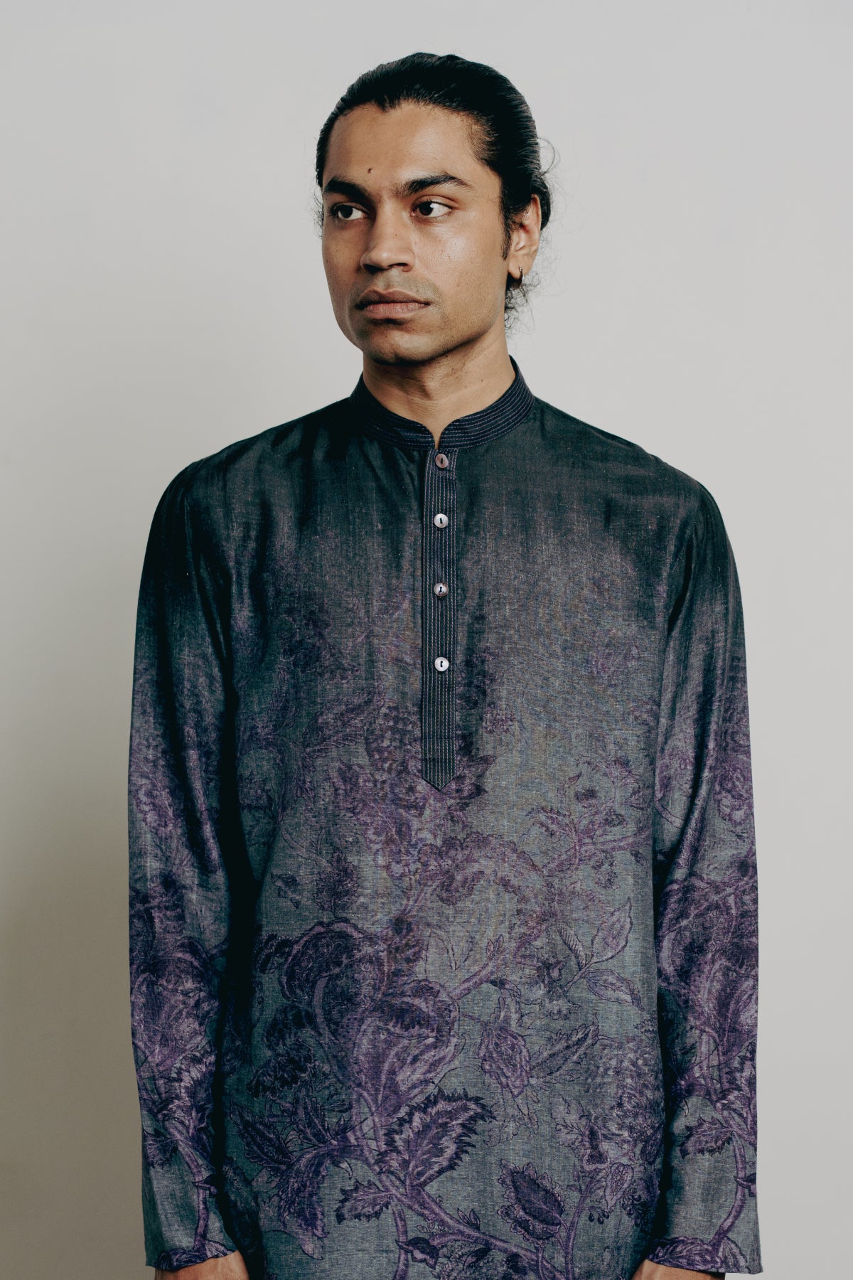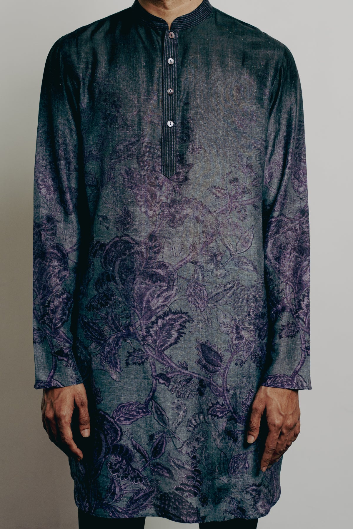 A mauve short kurta adorned with degrade floral prints offers a sleek and stylish interpretation of traditional attire, combining timeless charm with contemporary flair. Paired with pants for a complete look.