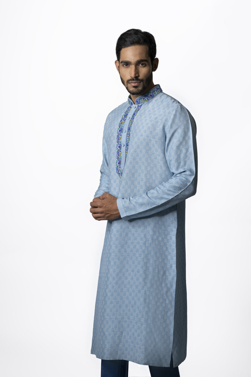 Featuring a Sky kurta in Tussar with hand embroidery and hand block print. It is paired with contrasting churidar pants.