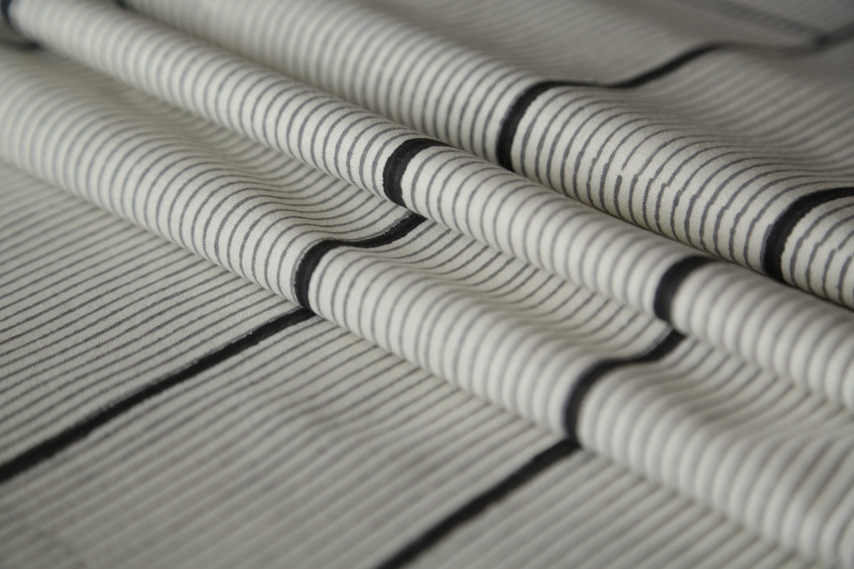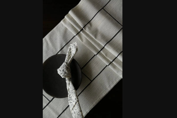 This printed table runner is hand block printed with natural pigments in black and grey. Pair it with our matching selection of table mats, cocktail napkins and dinner napkins.