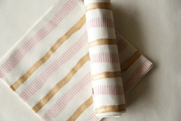 These elegant cocktail napkins are hand block printed in pink and gold, the colors are sure to spark a conversation.