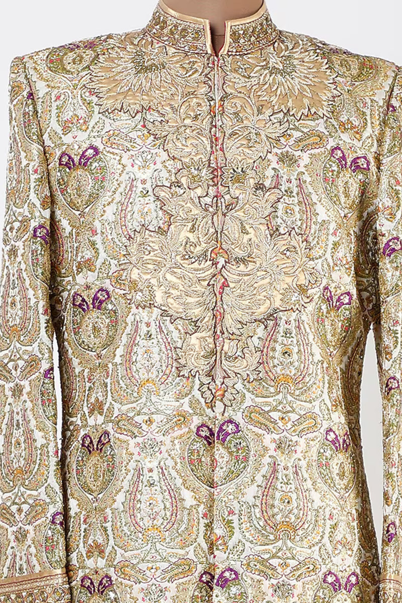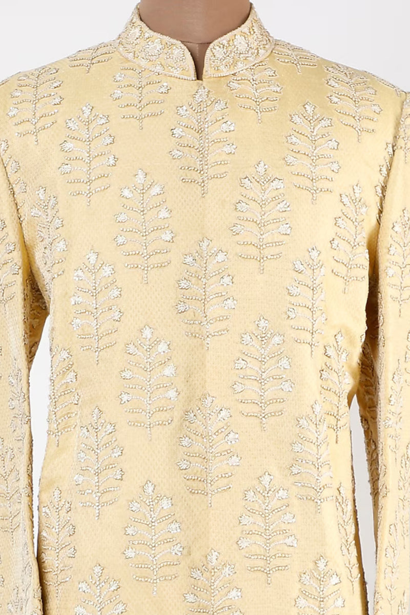 Beige Cotton Viscose Hand Embroidered Sherwani Set