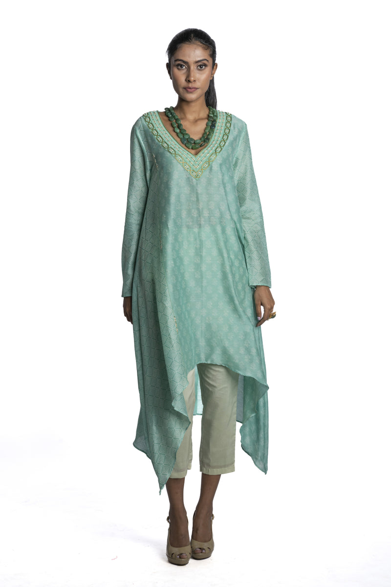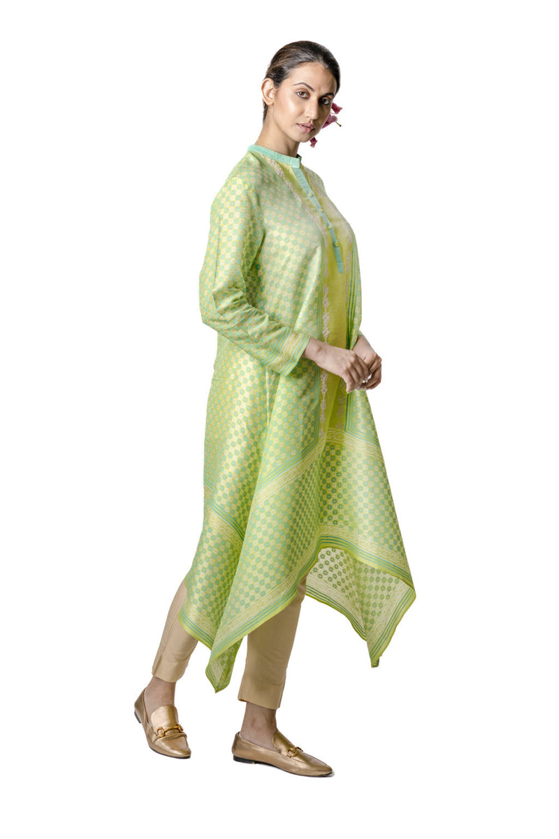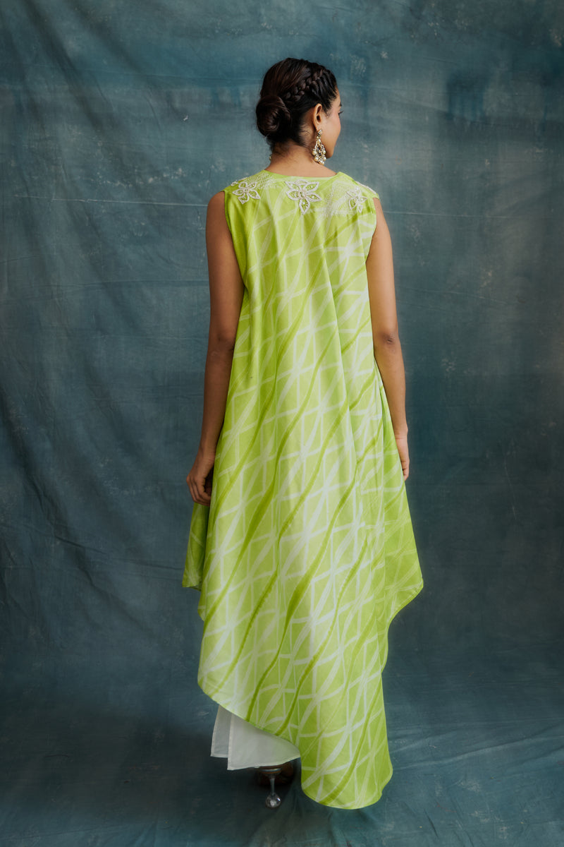 Lime Green Tussar Hand Embroidered & Tie-Dyed Draped Tunic