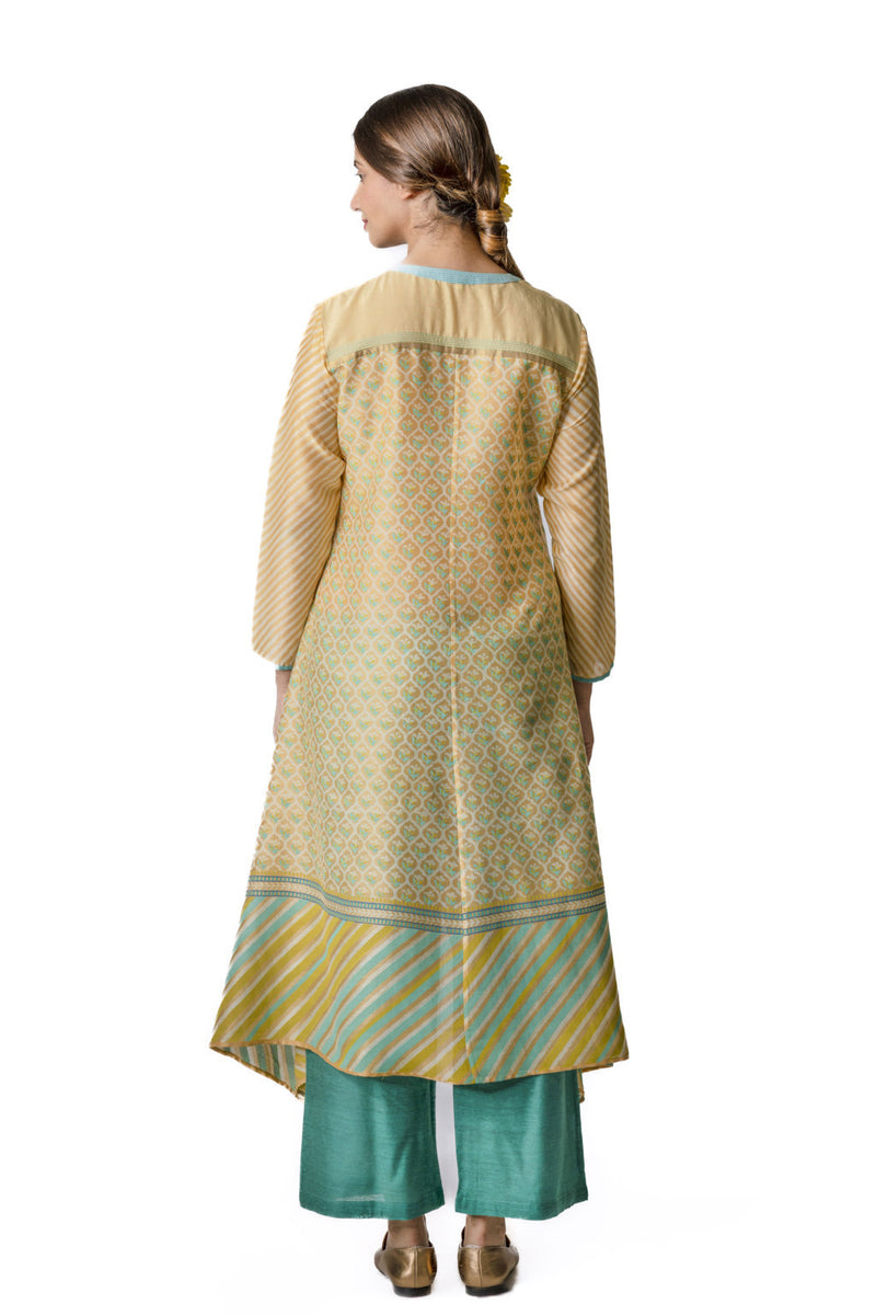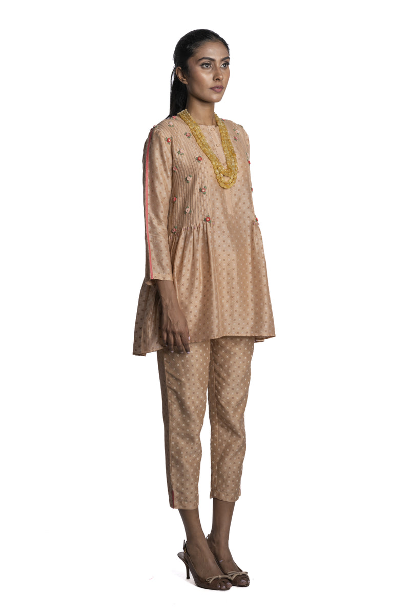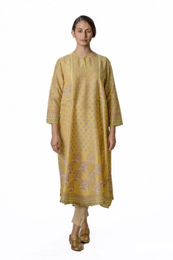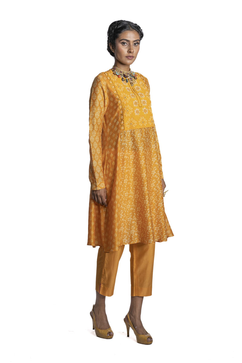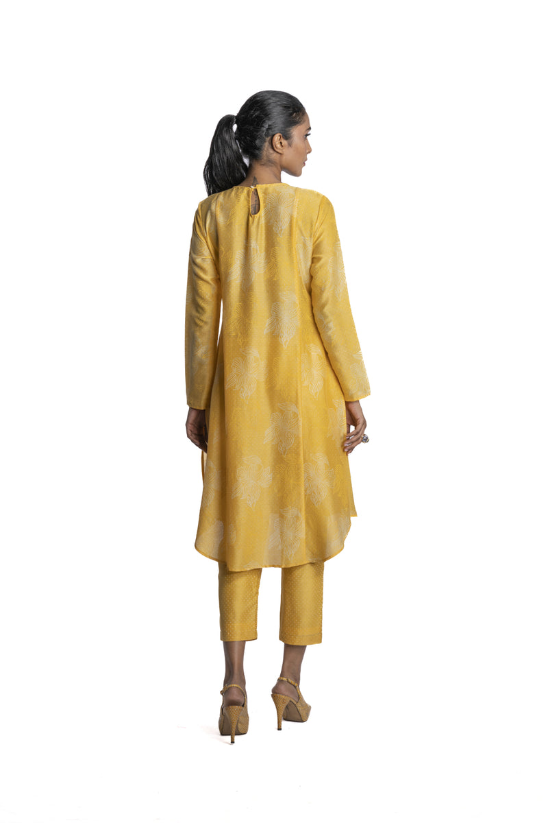 Mustard Chanderi Tunic With Floral Block Printed Motifs