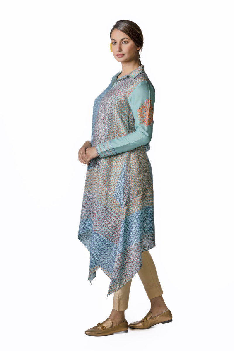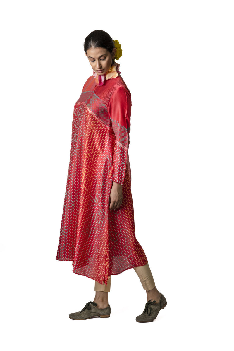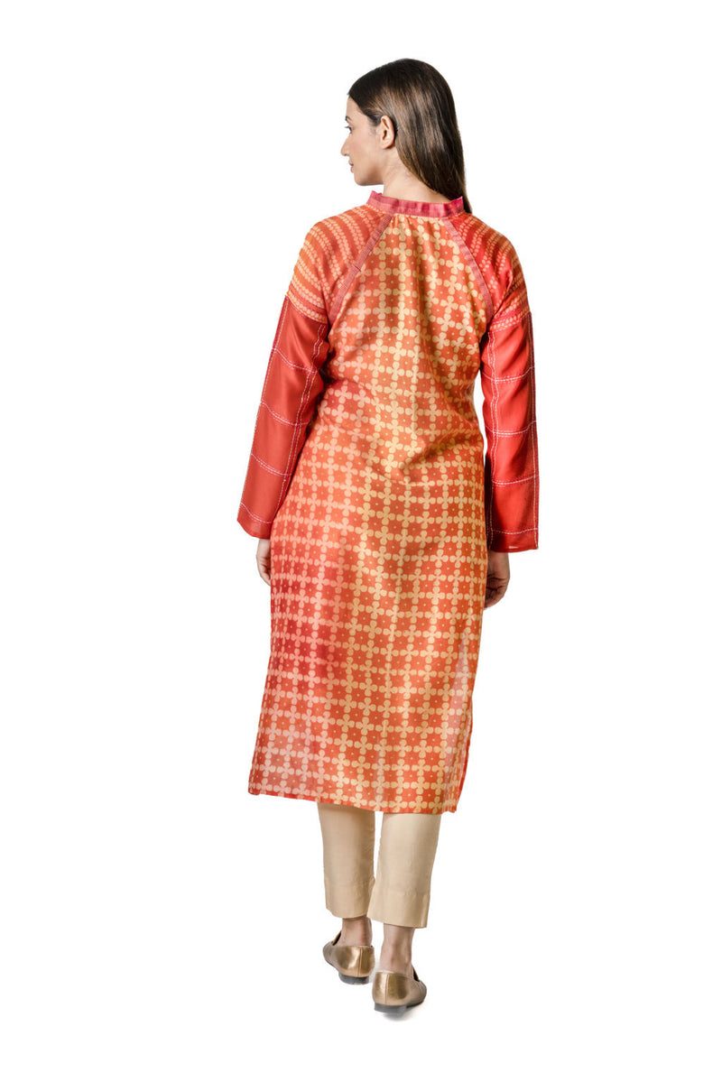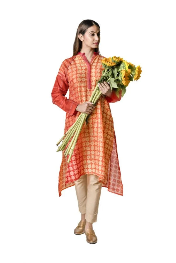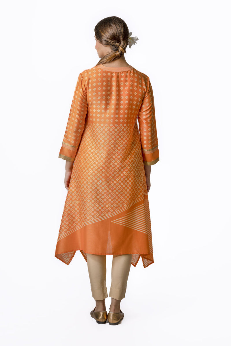 Orange Asymmetric Chanderi Tunic With Stripes, Geometric Block Print