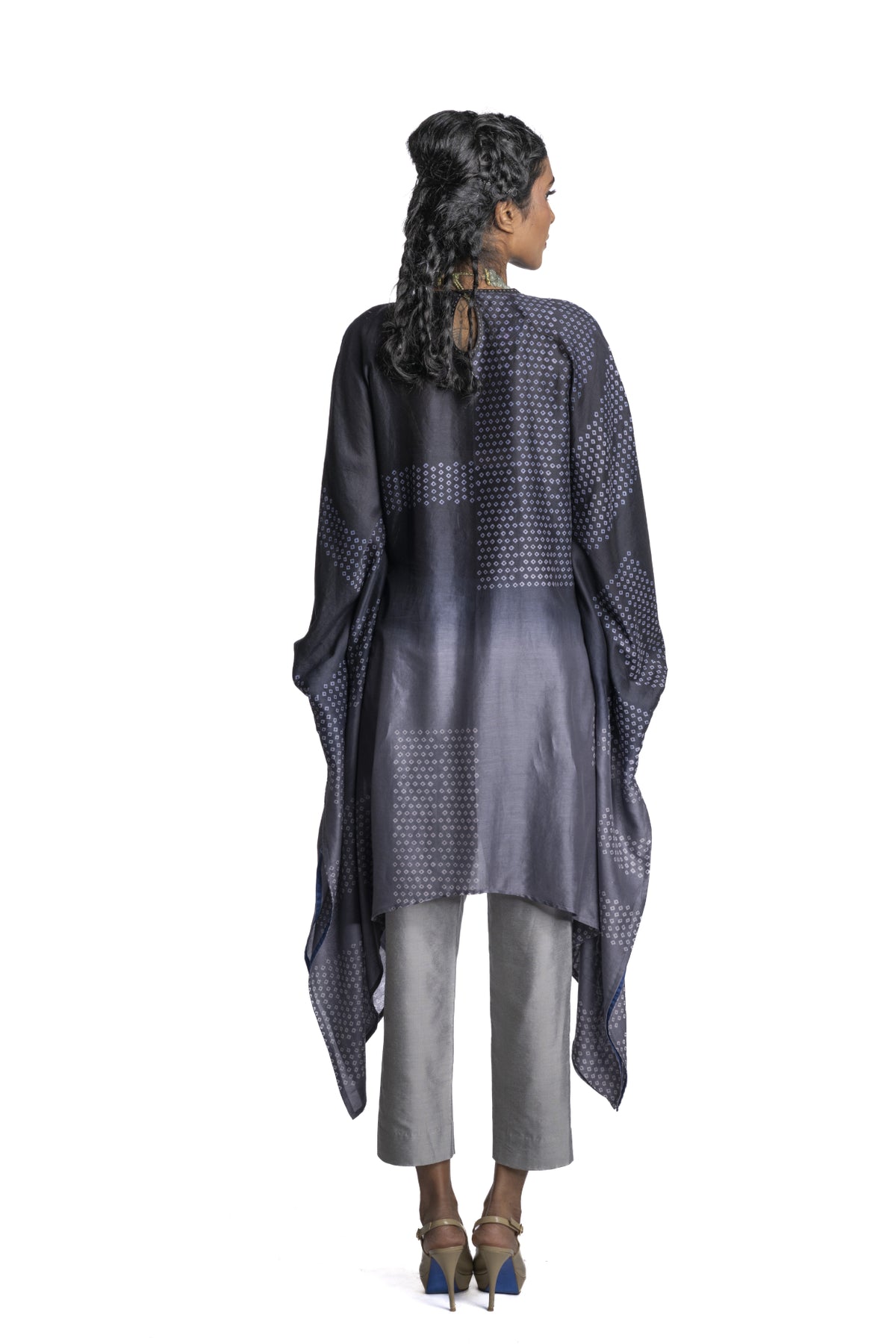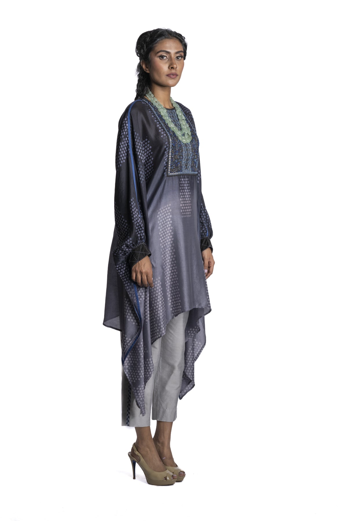 Black grey shaded chanderi printed kaftan with hand embroidered detailing & pants