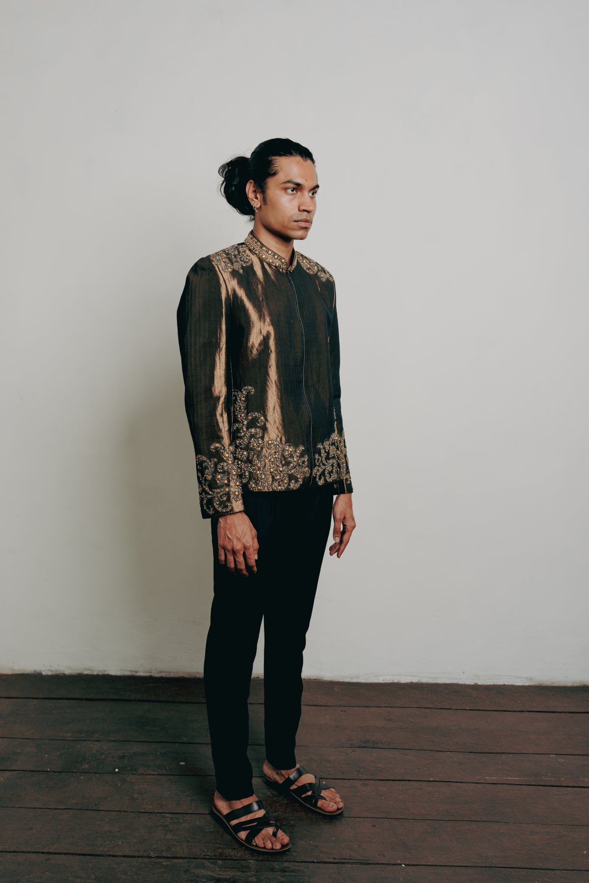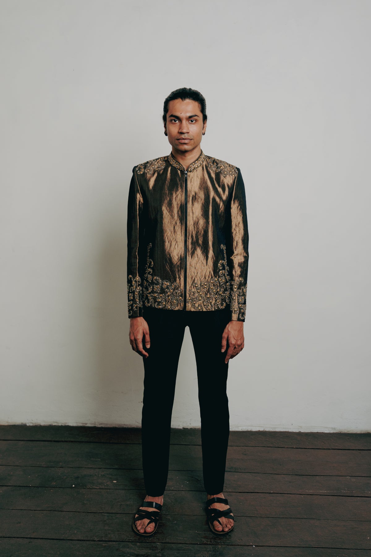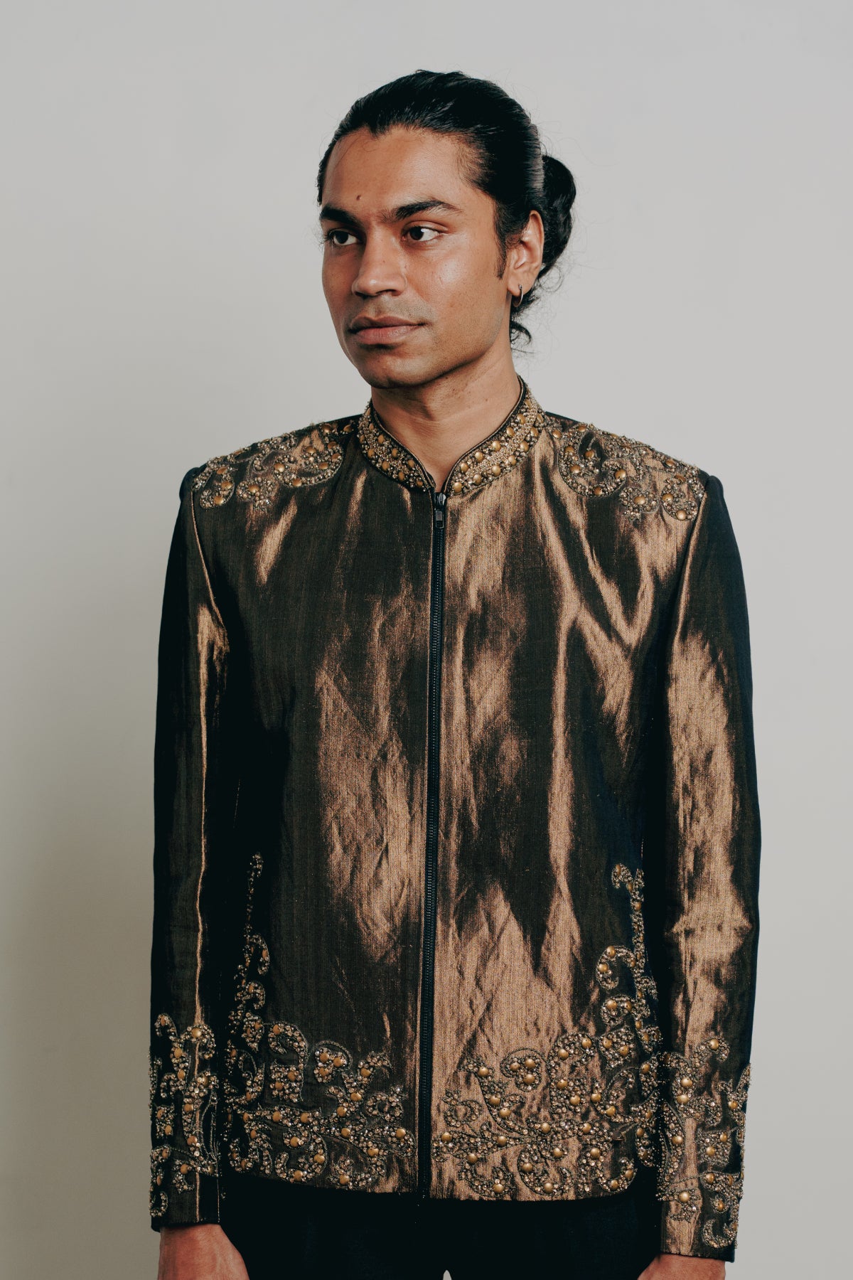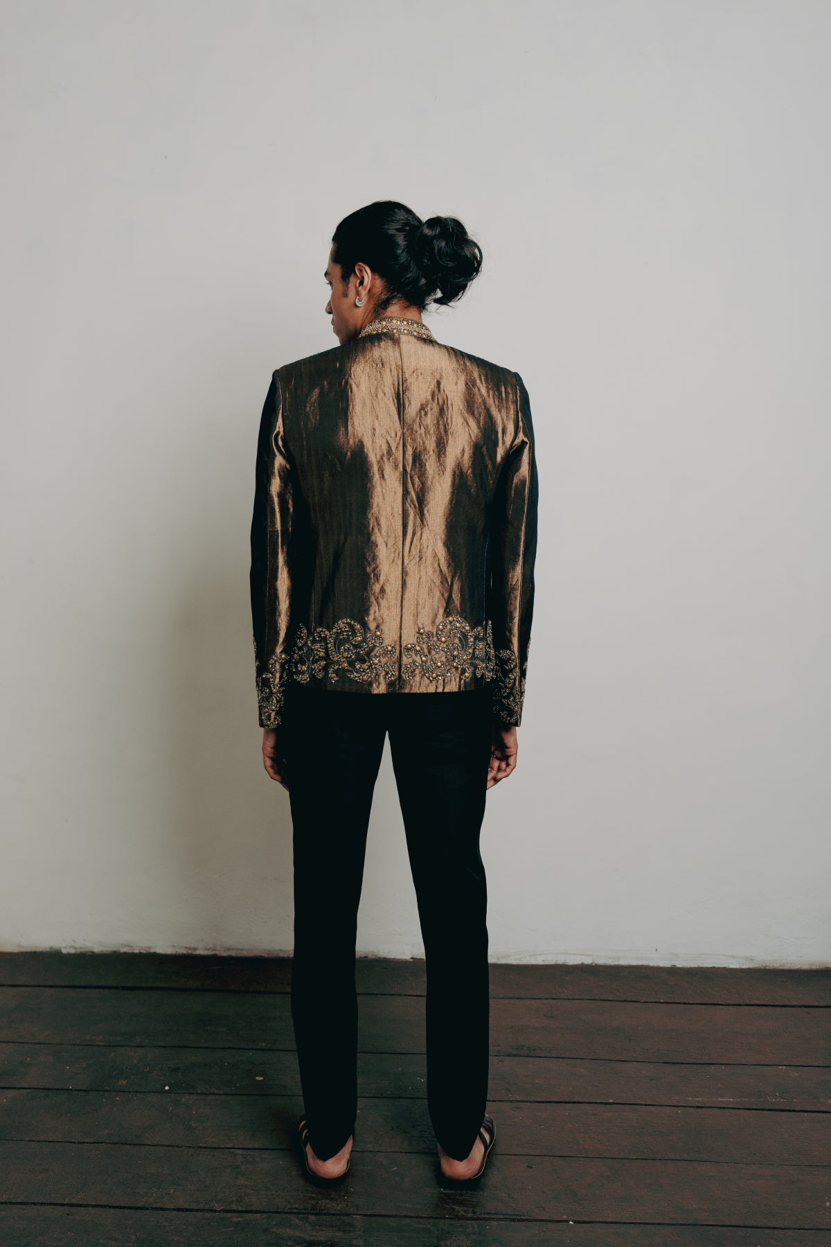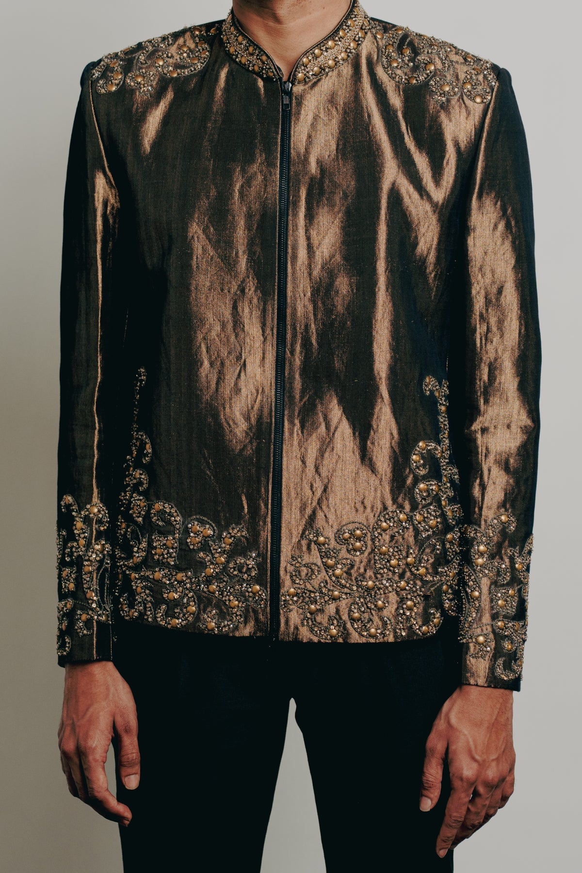 A copper metal tissue jacket hand-embroidered with antiquated metal sequins and beads creates a vintage-inspired outfit with its ornate detailing and timeless appeal.