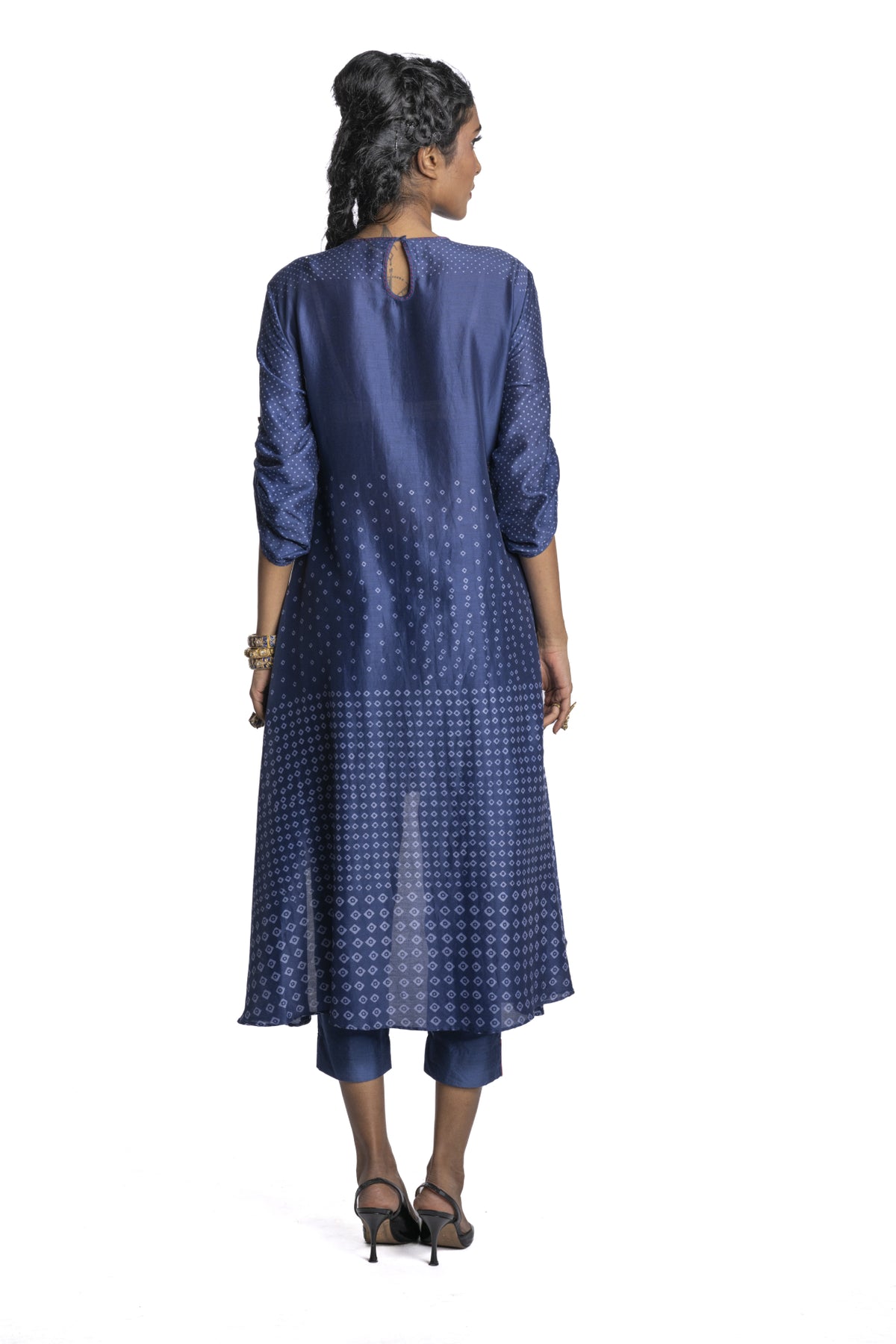 Indigo chanderi Printed asymmetric tunic with hand embroidered yoke & matching pant.