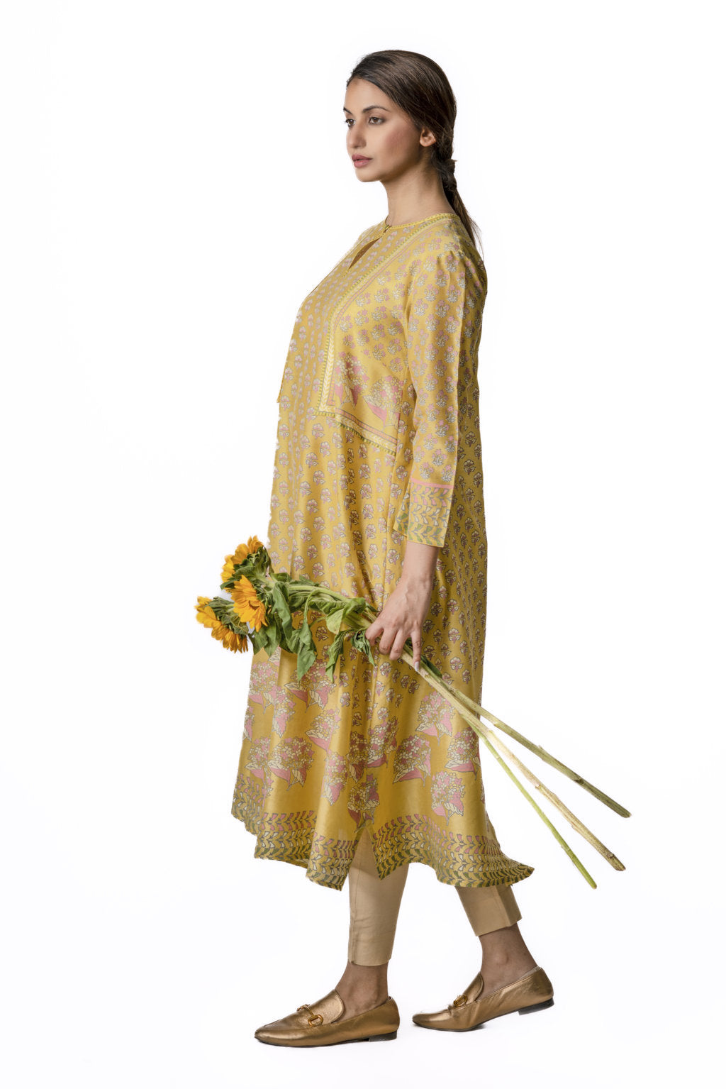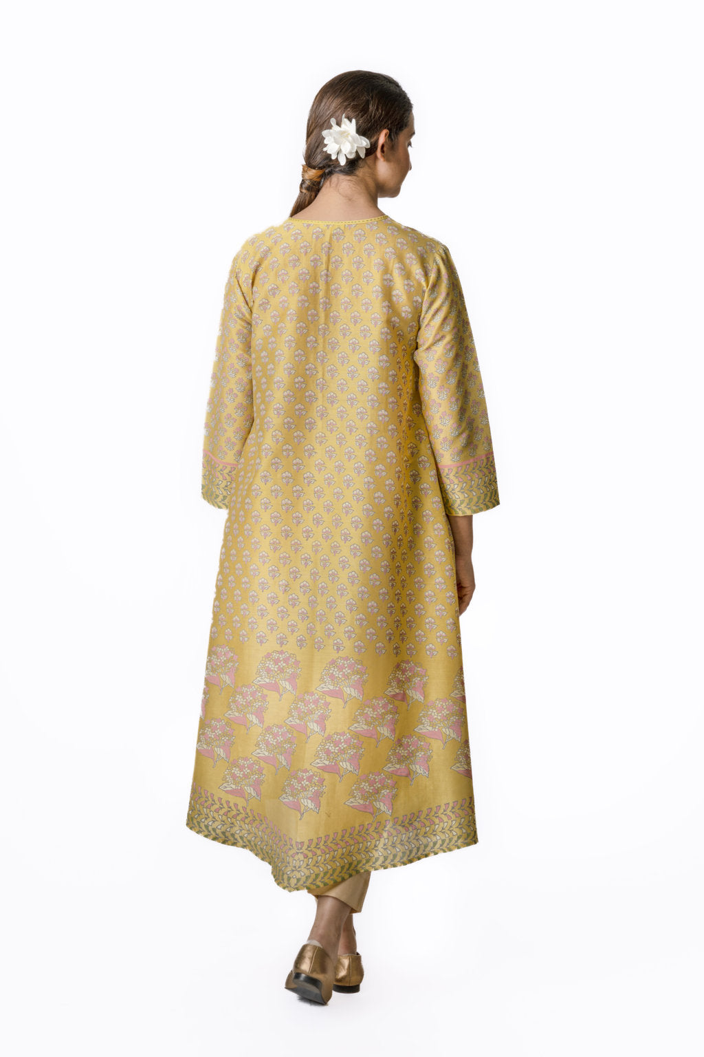 Mustard Chanderi Tunic With Floral Block Printed Motifs