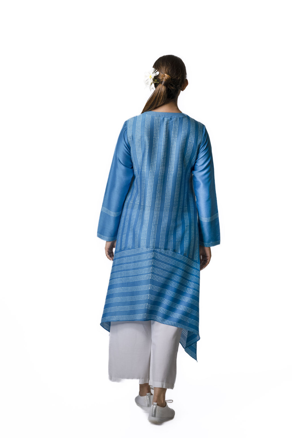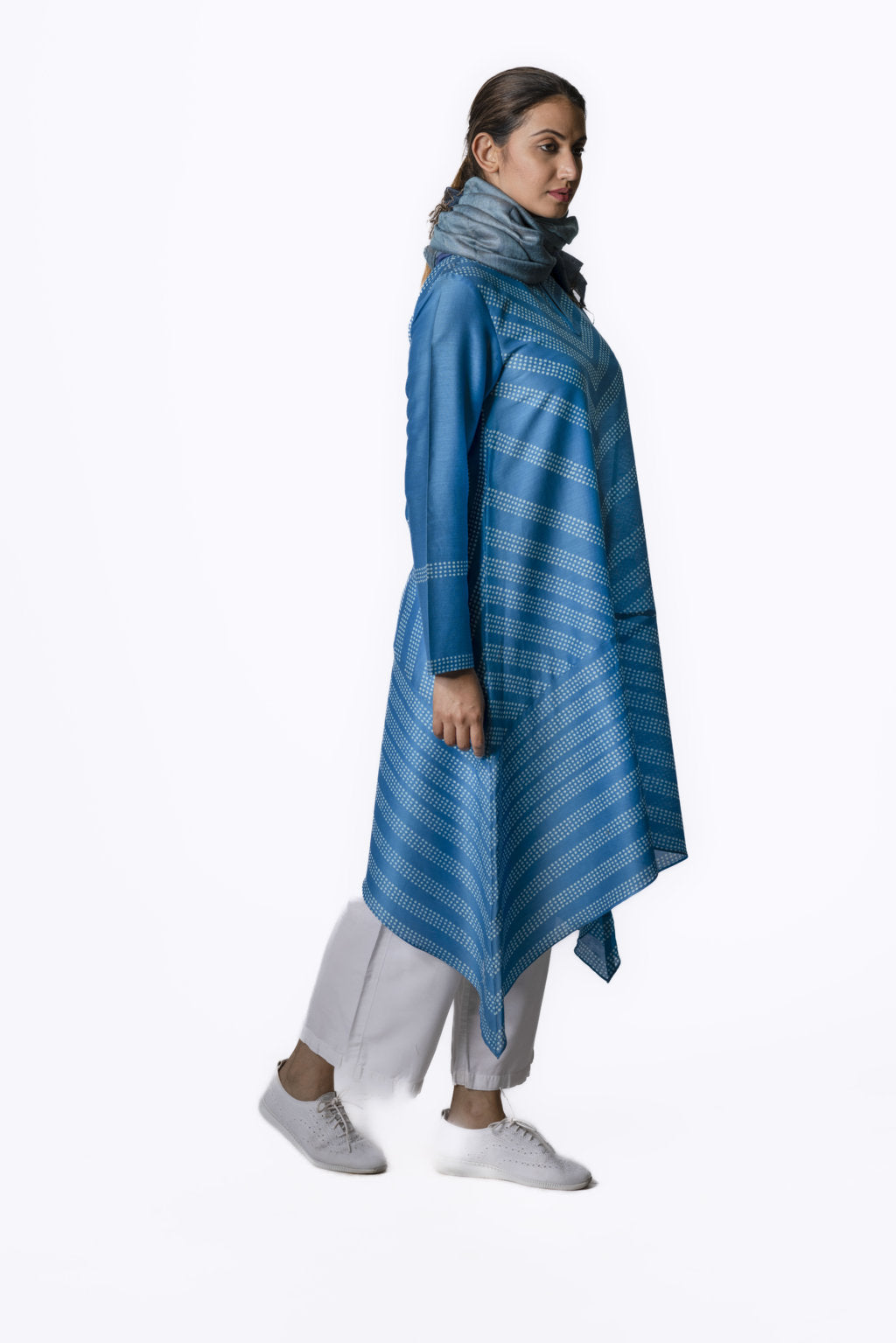 Ocean asymmetric tunic with polka dot block printed panels & embroidered neckline.