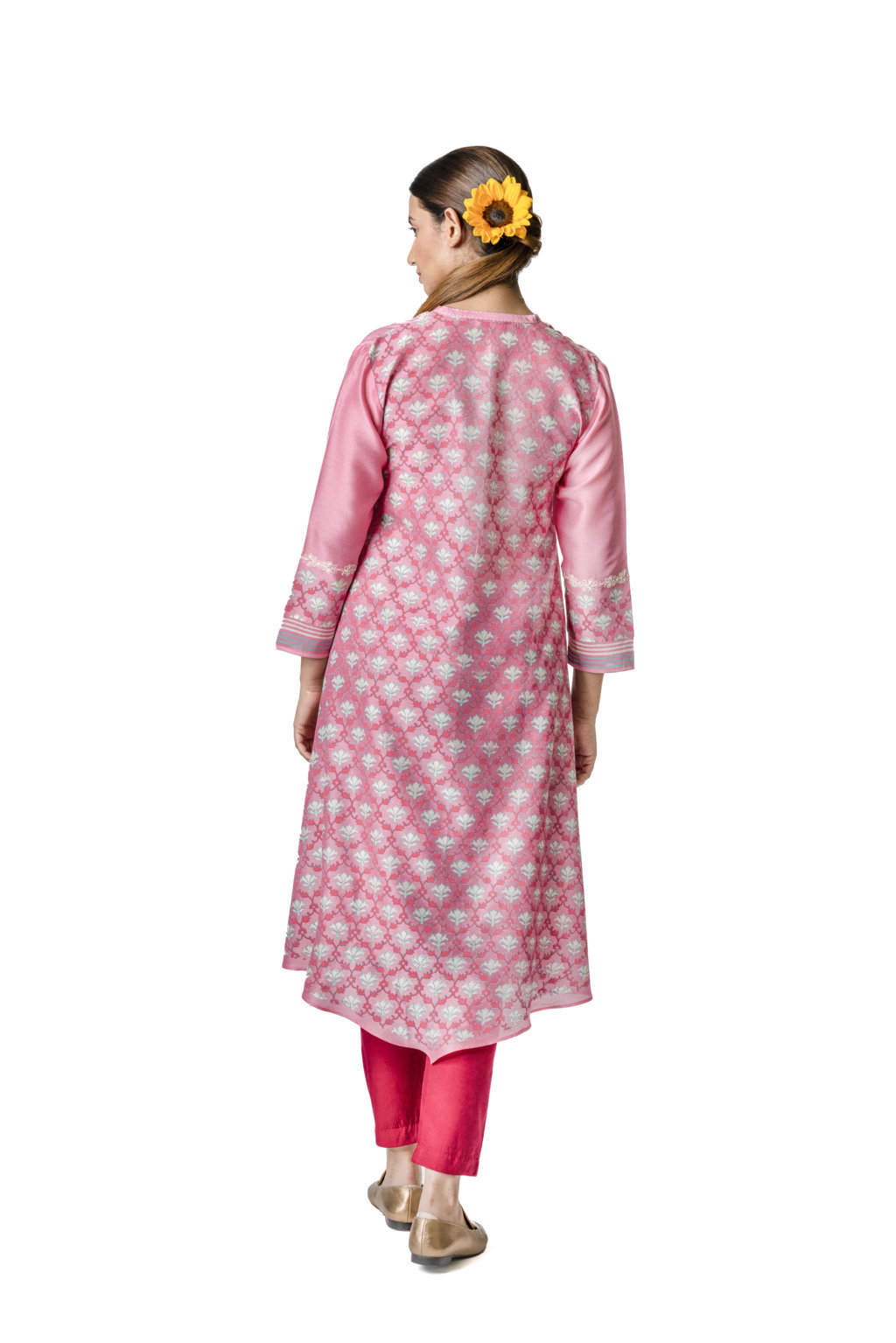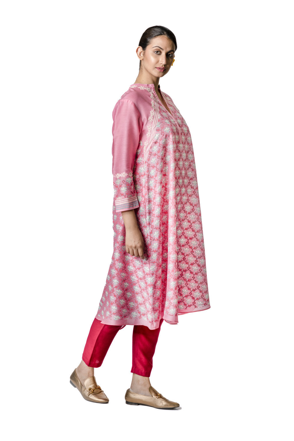 Pink chanderi tunic with floral block print, striped cuffs & floral embroidery.