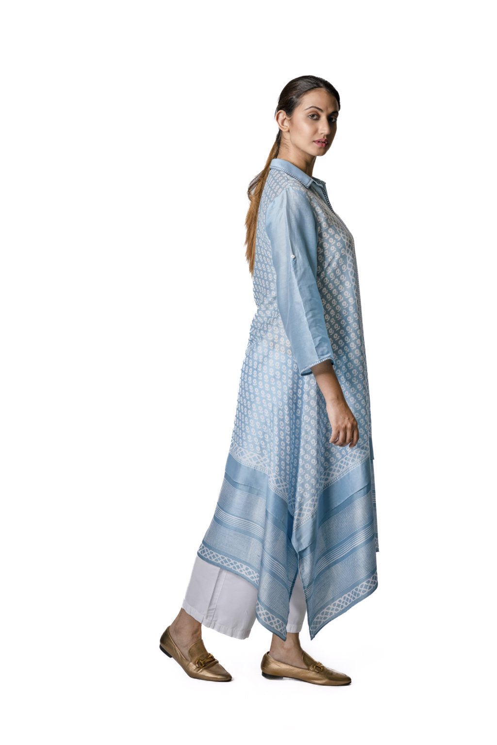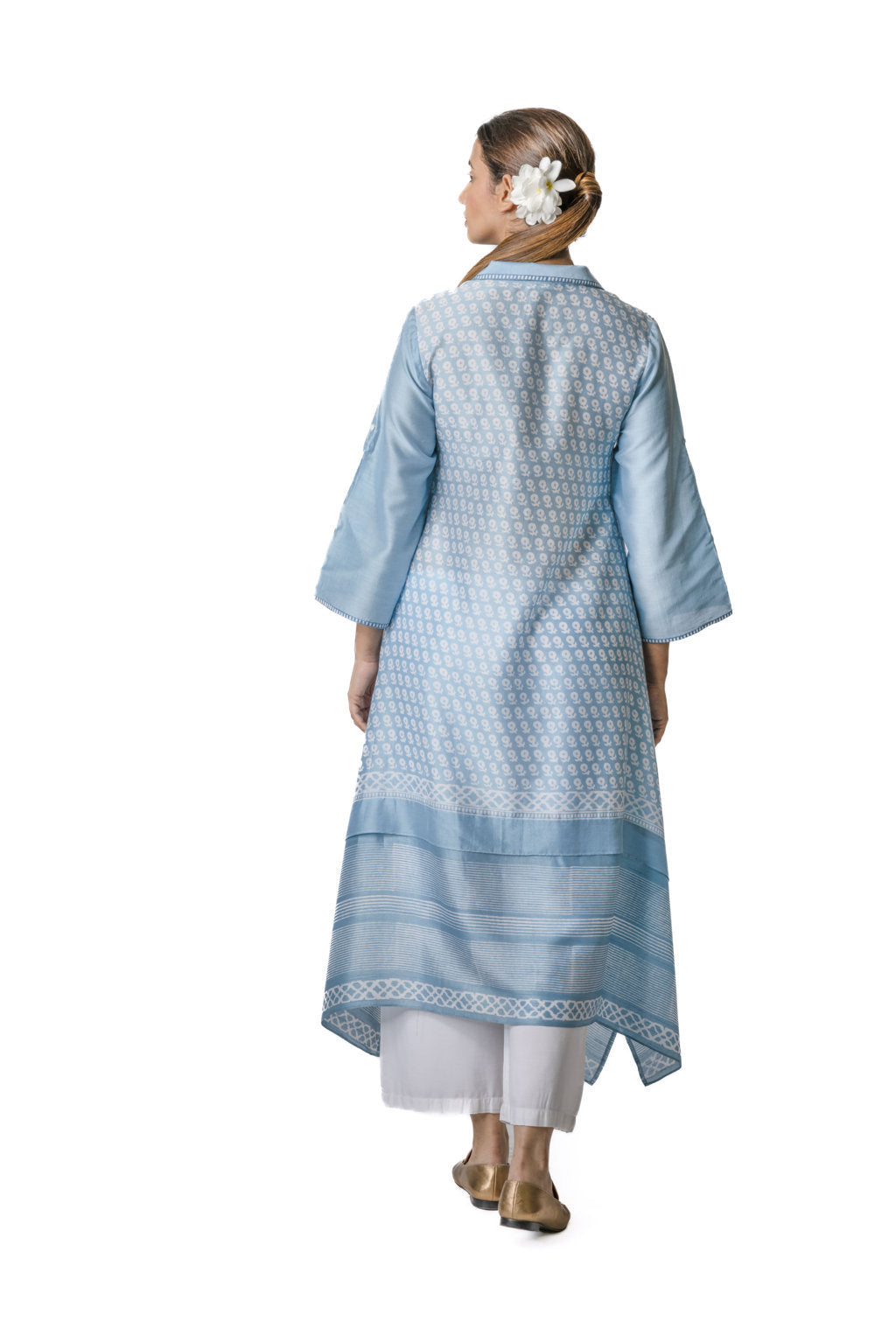 Sky blue asymmetric chanderi tunic with floral block print, roll tab sleeves & embroidered bodice.
