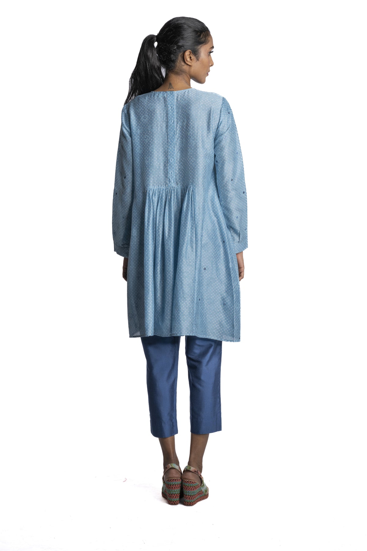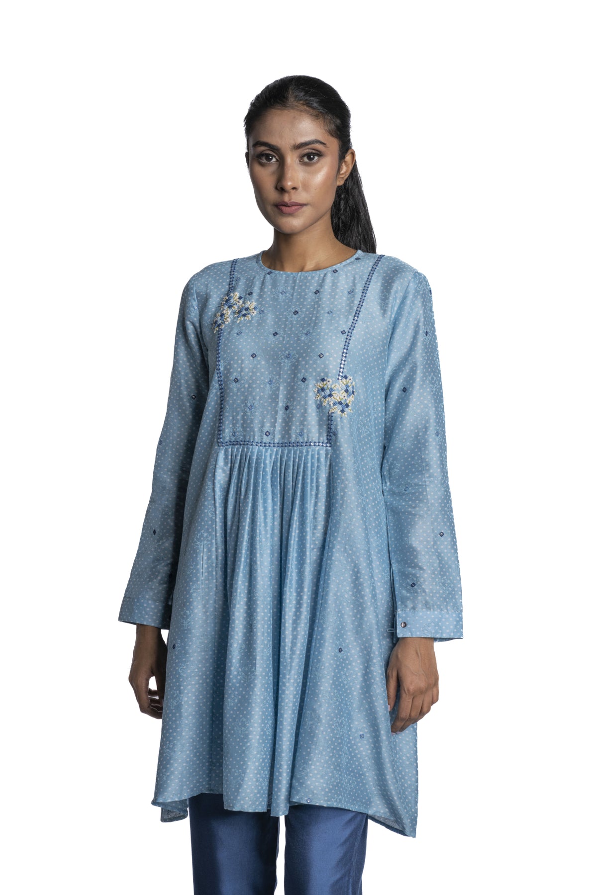 Sky blue chanderi printed tunic with hand embroidered detailing & plain pants