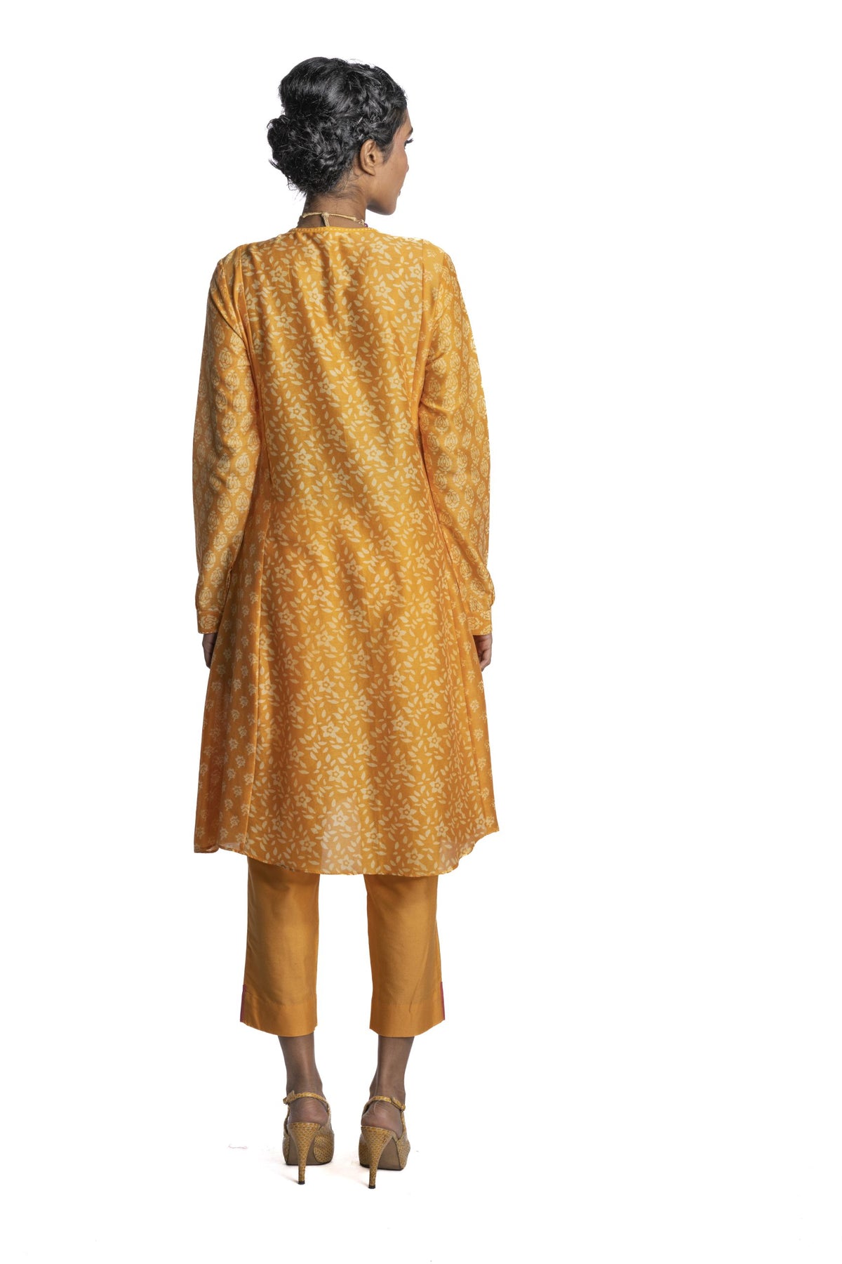 Yellow chanderi printed tunic with hand embroidered detailing & matching pant.
