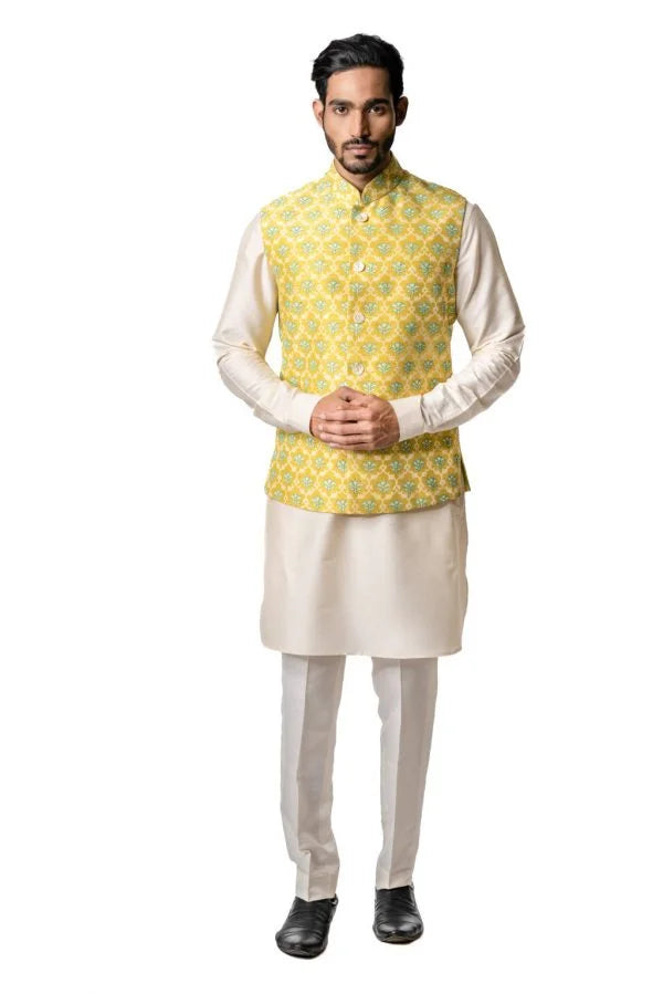 Yellow Tussar Embroidered & Block Printed Bundi Jacket