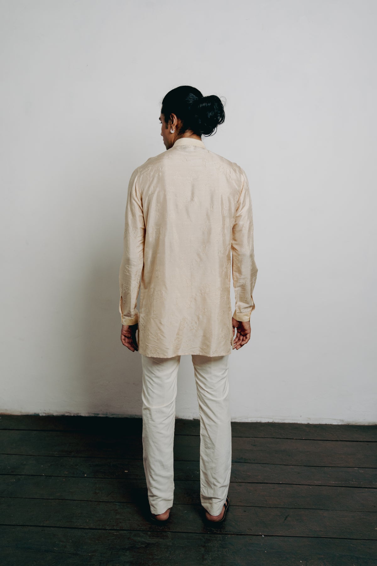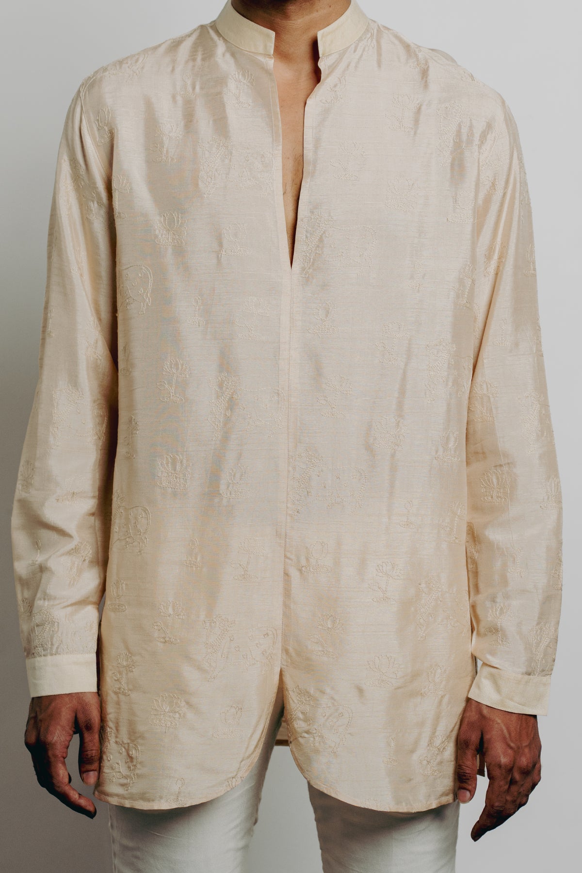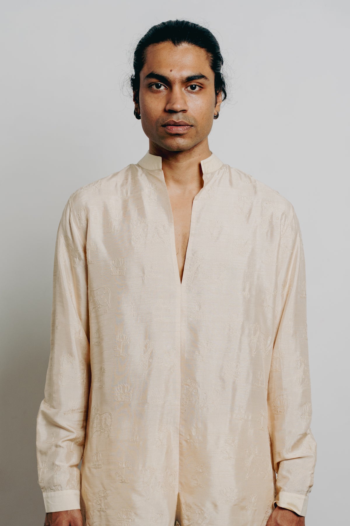 A beige short kurta adorned with all-over lotus-cow embroidery, blending cultural motifs with modern style for a truly captivating and unique piece.