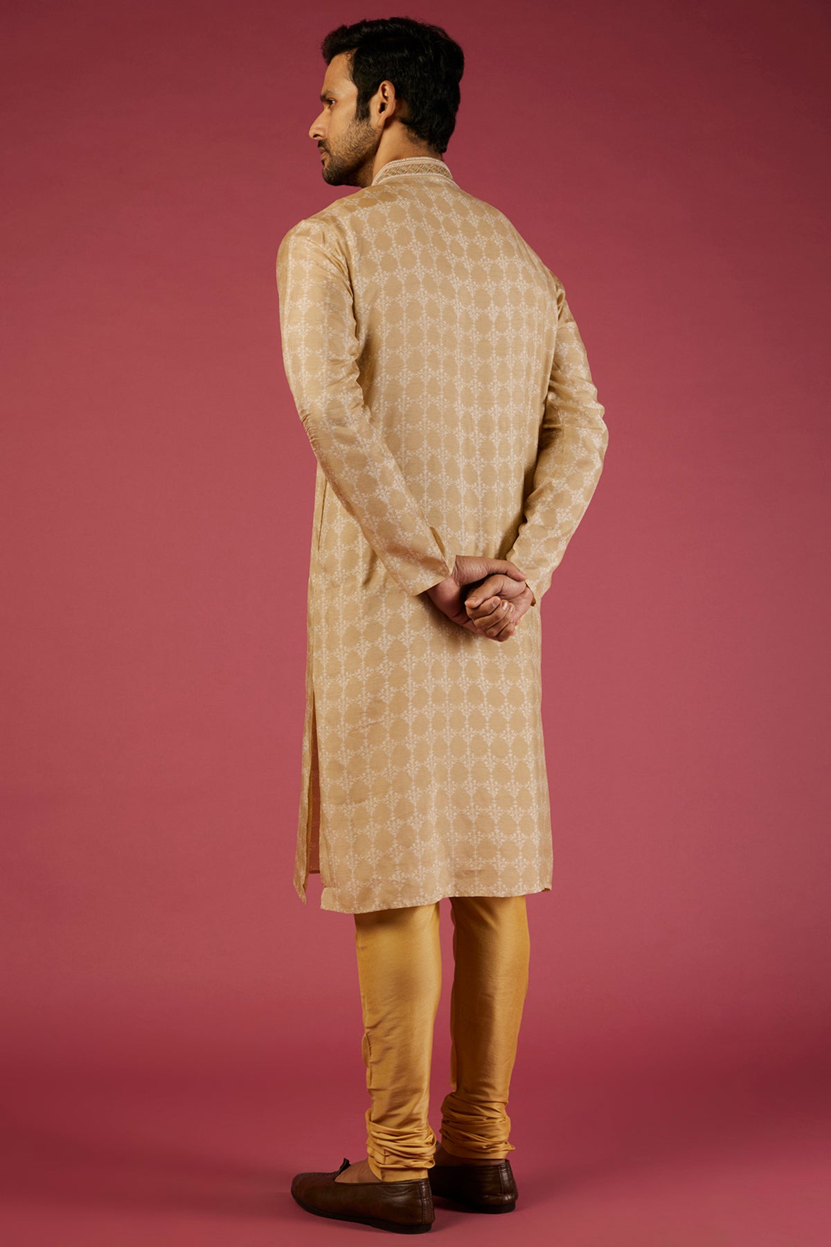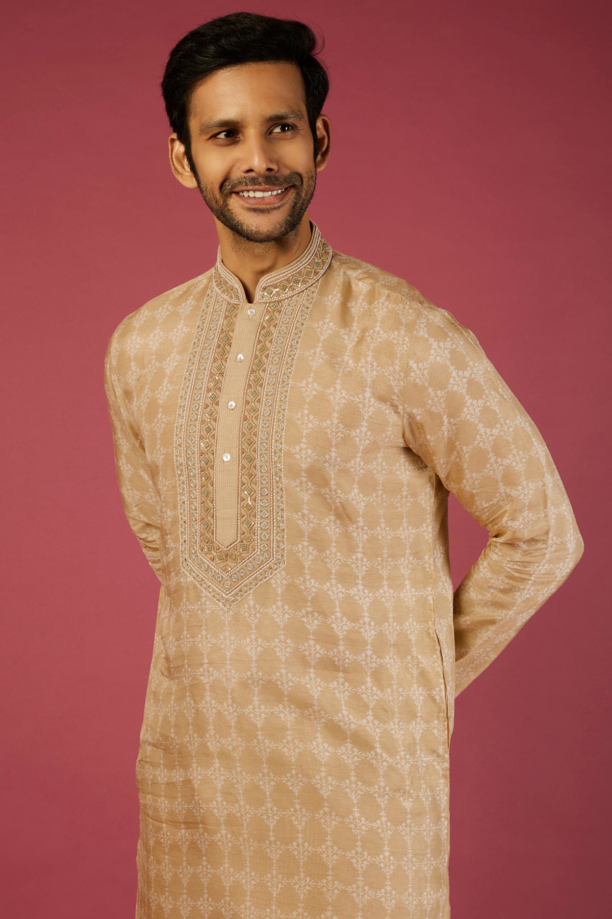 Beige Tussar Floral Printed & Embroidered Kurta Set