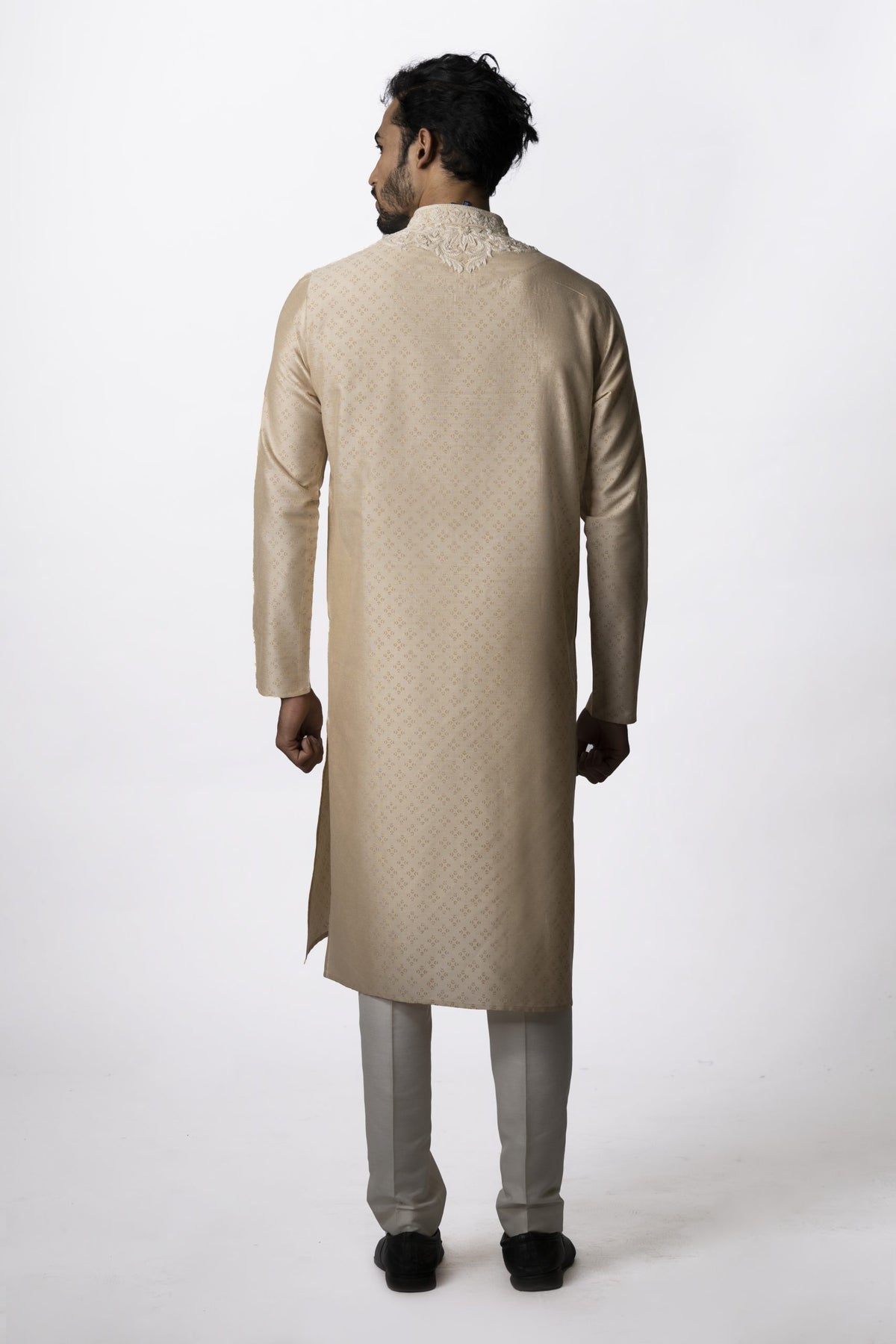 Featuring a grey kurta in viscose cotton base with block print and lucknowi hand embroidery. It is paired with contrasting churidar pants.
